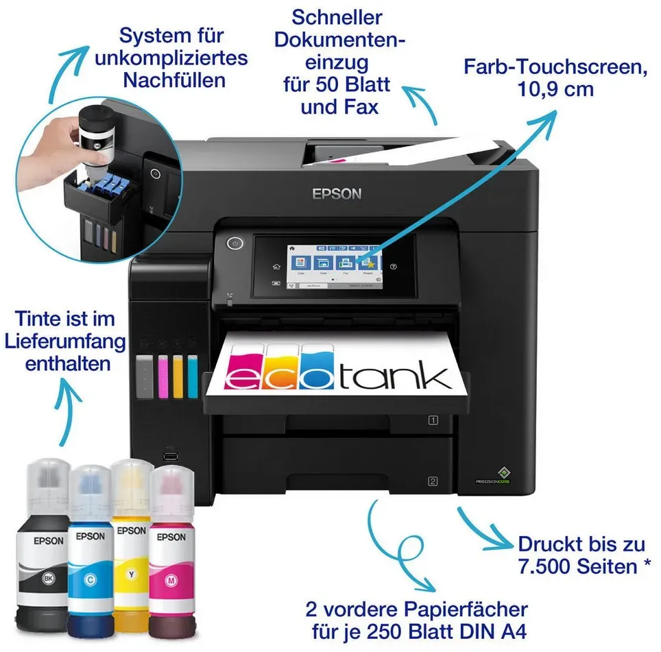Epson - EAN: 8715946677224 - Leistung rauf Kosten runterDieser 4-in-1-Drucker arbeitet schnell und . Dank großer Tintentanks sind keine Patronen erforderlich und die mitgelieferte Tinte reicht für tausende Seiten bei extrem niedrigen Seitenkosten.Schnelles Drucken und ScannenNiedrige SeitenkostenMultifunktionsdrucker mit ADFMit diesem benutzerfreundlichen EcoTank-Modell erledigen Sie Ihre Druck-, Scan-, Kopier- und Faxaufträge im Handumdrehen und sparen dabei nicht nur Zeit, sondern auch Geld dank besonders niedriger Seitenkosten. Neben hohen Druck- und Scangeschwindigkeiten für Formate bis DIN A4 sorgen zwei vordere Papierkassetten für je 250 Blatt sowie ein hinterer Papiereinzug und ein ADF (automatischer Dokumenteneinzug) für je 50 Blatt für zusätzlichen Druckkomfort. Zahlreiche weitere Features wie mobiles Drucken, Ethernet oder ein 10,9 cm großer LCD-Touchscreen erleichtern Ihnen Ihren Arbeitsalltag.Effizienz neu definiert5,5 Sekunden so schnell liefert der ET-5800 die erste gedruckte Seite. In Kombination mit der Duplexfunktion für beidseitiges Drucken und dem automatischen Dokumenteneinzug werden Ihre alltäglichen Druckaufträge zügiger denn je erledigt.DIN A4-Drucker mit vielen FunktionenDer EcoTank ET-5850 wurde für das Drucken, Scannen, Kopieren und Faxen bis DIN A4 konzipiert. Sämtliche Funktionen können Sie einfach und bequem über den großen LCD-Touchscreen auswählen und ausführen. wie nieDer ET-5850 wird mit Tinte für bis zu 4.500 / 2.800 Seiten in s/w bzw. So ... Sie erhalten mehr Ergebnisse, aktuelle Angebote und weitere Preisbereiche wenn Sie den Preisvergleich aktualisieren: Mehr epson et 5850 Angebote Jetzt live Meta-Preisvergleich starten! Epson et 5850 Testberichte