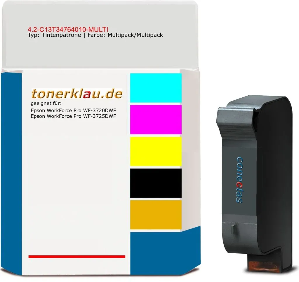 Kategorie: Druckerpatronen - Epson - GTIN:8715946632216 - Epson C13T34764010/34XL Tintenpatrone MultiPack Bk,C,M,Y High-Capacity 16,3ml + 3x10,8ml VE=4 für Epson WF-3720 - 106,03 Euro bei Toner-Partner24 - gefunden von billiger.de Dieses ToMax Multipack bietet eine kostengünstige Alternative zu Originalpatronen und ist ideal für preisbewusste Käufer. ![]() Tintencent er.com TonerPartner ToMax Multipack ersetzt Epson C13T 347x4010 / 34XL enthält 4 x Tintenpatrone