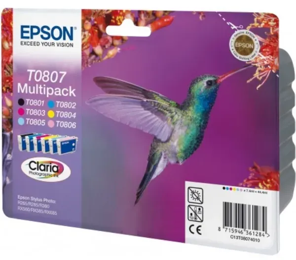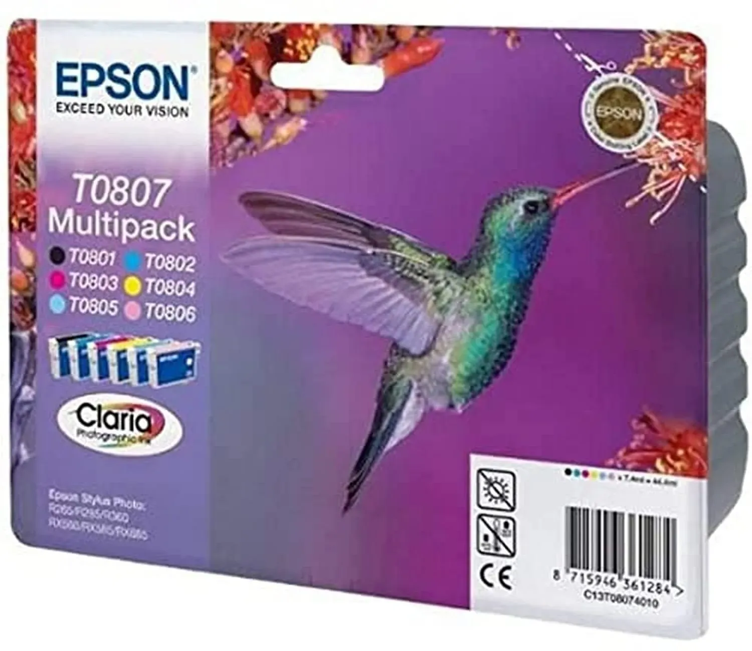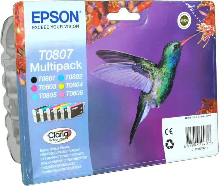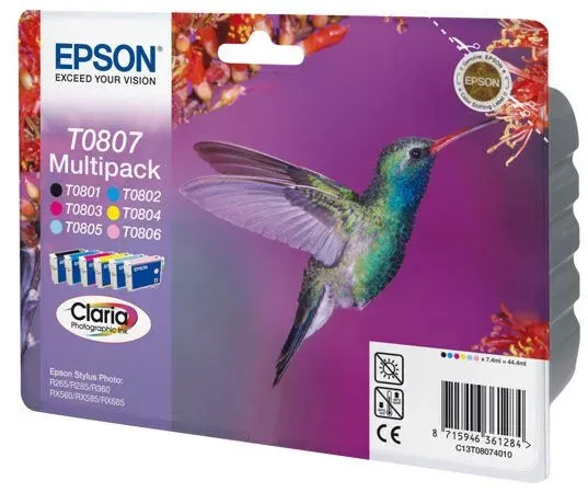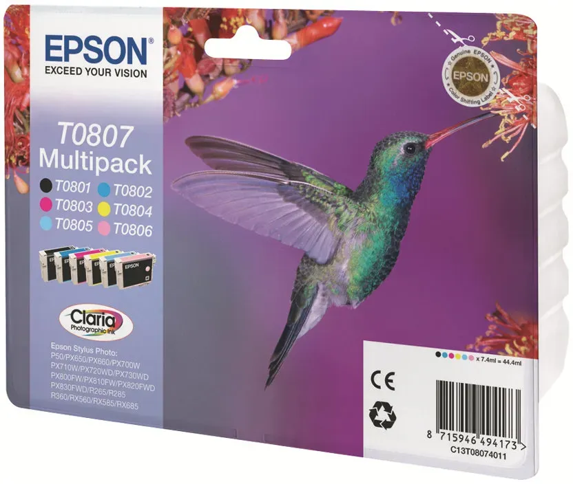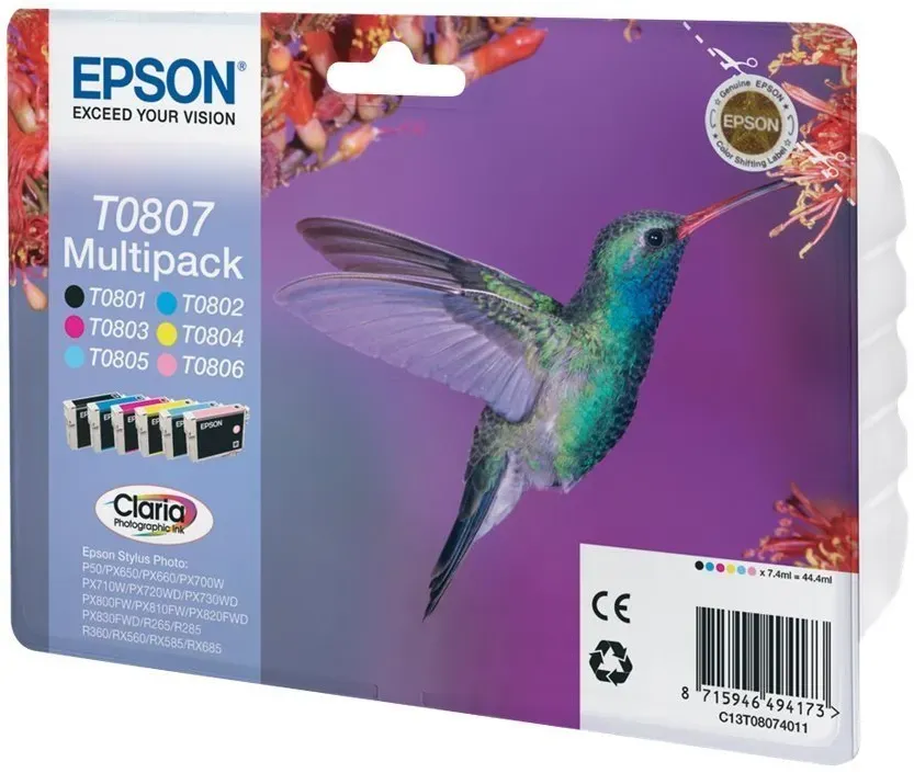 Kategorie: Druckerpatronen - Epson - GTIN:8715946494173 - Epson Original T0807 Kolibri Druckerpatronen 6er Multipack BK/C/M/Y/LC/LM (C13T08074020) - 71,41 Euro bei Office Partner GmbH - gefunden von billiger.de Ein Original Epson CLARIA Multipack, das für hochwertige Fotoausdrucke bekannt ist. ![]() ![]() Epson CLARIA Multipack T 080 T 0807