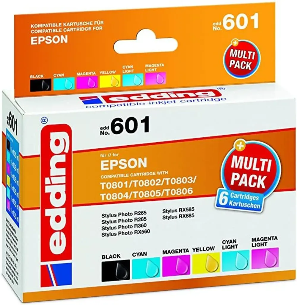 Zustand: Neu - Tintenpatronen für Drucker Tintenpatronen für Tintenstrahldrucker - ESMONLINE ESMOnline - T0801 T0802 T0803 T0804 T0805 T0806 - EAN: 4250614804211 - KOMPATIBEL zu Epson Stylus Photo P50, PX650, PX660 KOMPATIBEL zu Epson Stylus Photo PX700W, PX710W, PX720WD, PX730WD KOMPATIBEL zu Epson Stylus Photo PX810FW, PX820FWD, PX830FWD KOMPATIBEL zu Epson Stylus Photo R265, R285, R360, RX560, RX585, RX685 Füllmenge: ca. 15,0 ml Schwarz (BK) Reichweite: ca. 500 Seiten (je nach Einstellung) Füllmenge: ca. 14,0 ml Cyan (C), Magenta (M), Gelb (Y) Hellcyan (LC), Hellmagenta (LM) Reichweite: ca. 550 Seiten (je nach Einstellung) HALTBARKEIT: ab Kaufdatum (HINWEIS: Deaktivieren Sie automatische Druckerupdates. Ihre Ersatzpatronen funktionieren trotzdem.) - Verkäufer: ESMOnline (alle Preise inkl. Mehrwertsteuer) im amazon.de Marketplace Ein preiswertes kompatibles Multipack von Edding, einer bekannten Marke für Bürobedarf, bietet eine gute Alternative. ![]() ![]() edding kompatibel zu Epson T0807 Multipack color