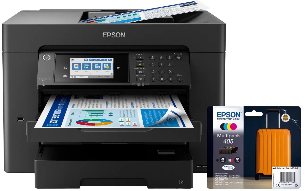 42 Händlerangebote bei billiger.de - Kategorie: Multifunktionsdrucker - Epson - Professioneller DIN A3-Druck - Multifunktionsdrucker für Kleinbüros und Home Offices; doppelseitiges Drucken, Scannen, Kopieren und Faxen; automatischer Dokumenteneinzug für bis zu 50 Blatt; 2 x 250 Blatt vordere Papierkassette Höhere Produktivität - beidseitiges Drucken, Scannen und Kopieren bis DIN A3 und Druckgeschwindigkeiten von bis zu 25 Seiten/Min. in sw und 12 Seiten/Min. in Farbe*; einfache Bedienung dank einer intuitiver Benutzeroberfläche und 6,8-cm-Touchscreen Weniger Ausgaben - reduzieren Sie Ihre Kosten dank separater Einzelpatronen; die Patronen sind in Standard- und XL-Größen verfügbar; mit der XL-Patrone können Sie bis zu 1.100 Seiten drucken* Flexible Konnektivität - NFC, Ethernet, WiFi und WiFi Direct sowie kostenlose Apps für mobiles Drucken sorgen für maximale Flexibilität; E-Mail Print, Scan-to-Cloud Auf der Epson ReadyPrint Webseite mit dem Code 'AMAZON3' ReadyPrint Flex-Tarif aktivieren und 3 Monate gratis drucken; danach ab 1,99 pro Monat günstig weiter drucken ReadyPrint Flex: flexible Tintentarife ab 1,99 pro Monat; Tinte wird nach Hause geliefert, noch bevor sie zur Neige geht; monatlich kündbar Lieferumfang: Hauptgerät, separate Einzelpatronen, Stromkabel, Schnellstartanleitung, dokument - GTIN:8715946668390 Dieses Angebot ist preislich sehr attraktiv und bietet den Drucker zu einem der niedrigsten Preise. printabout .de Epson WorkForce WF-7840DTWF - Tintenstrahldrucker