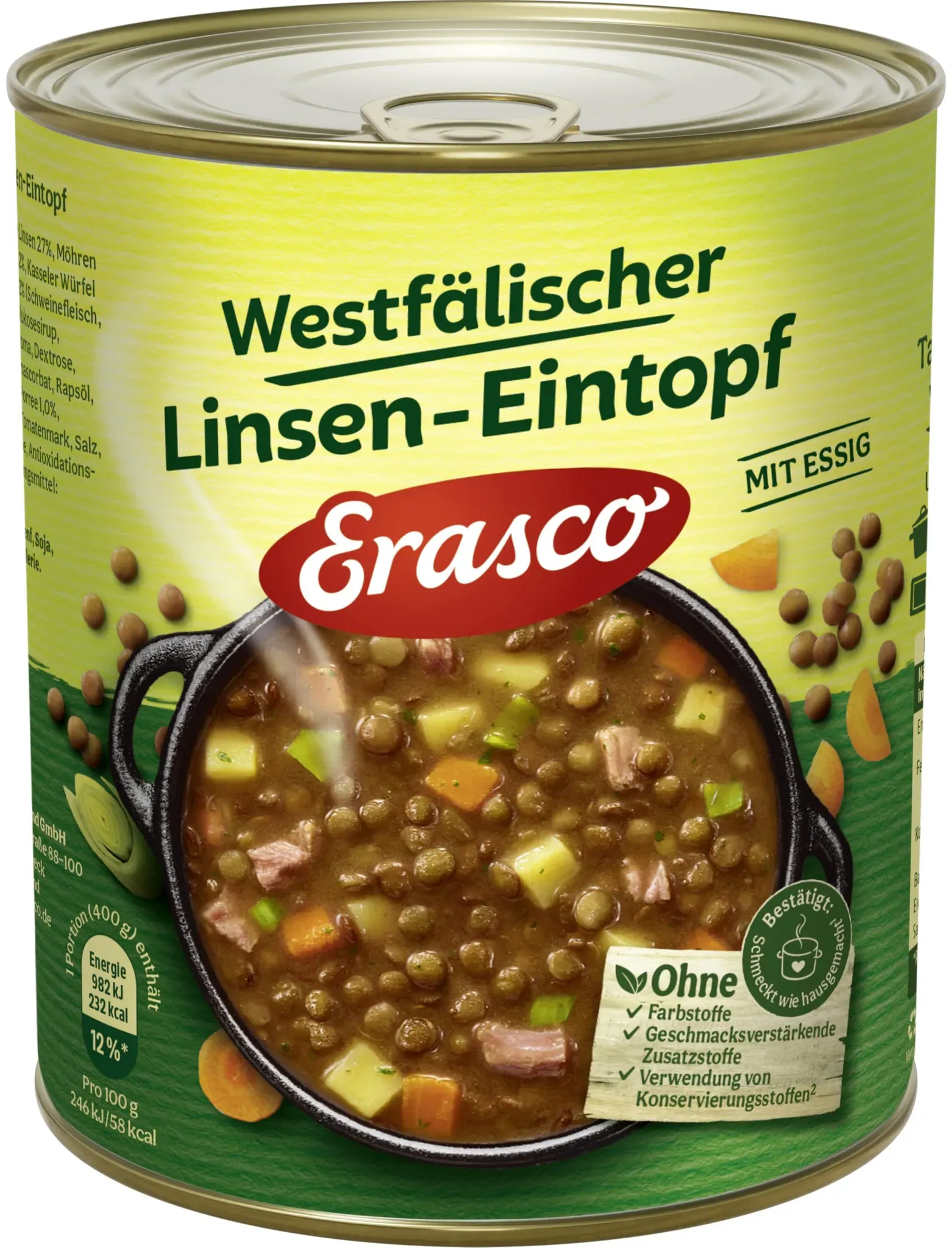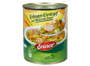 1 Händlerangebote bei billiger.de - Kategorie: Fertiggerichte - Erasco - EINFACH LECKER: Wir bereiten unseren Westfälischer Linsen-Eintopf sorgfältig und mit Liebe zu, so macht ERASCO deinen Tag einen Löffel wärmer! WENIGER IST MEHR: ERASCO Produkte sind ohne Farbstoffe, ohne geschmacksverstärkende Zusatzstoffe und ohne Verwendung von Konservierungsstoffen hergestellt (in Suppen & Eintöpfen in Dosen, lt. Gesetz) MIT GEMüSE: Erntereifes Gemüse liefert die Basis für den unverwechselbaren ERASCO Geschmack perfekt abgeschmeckt mit ausgewählten Gewürzen und aromatischen Kräutern. EINFACH UND SCHNELL ZUBEREITET: Keine Zeit zu kochen? Mit uns ist trotzdem Zeit, lecker zu essen. Egal, ob zuhause, auf der Arbeit oder unterwegs: Der ERASCO Westfälischer Linsen-Eintopf schmeckt immer und macht dein Tag einen Löffel wärmer. PERFEKT FüR CAMPING UND FESTIVALS: ERASCO ist nicht nur dein ständiger Begleiter im Alltag, sondern auch perfekt für Camping und Festivals. Schnell, einfach, lecker! - GTIN:4037300108231 Dieser Erbsen mit Würstchen Eintopf ist ein Klassiker und bietet ein gutes Preis-Leistungs-Verhältnis für eine schnelle Mahlzeit. ![]() Erasco Erbsen mit Würstchen Eintopf 800,0 g