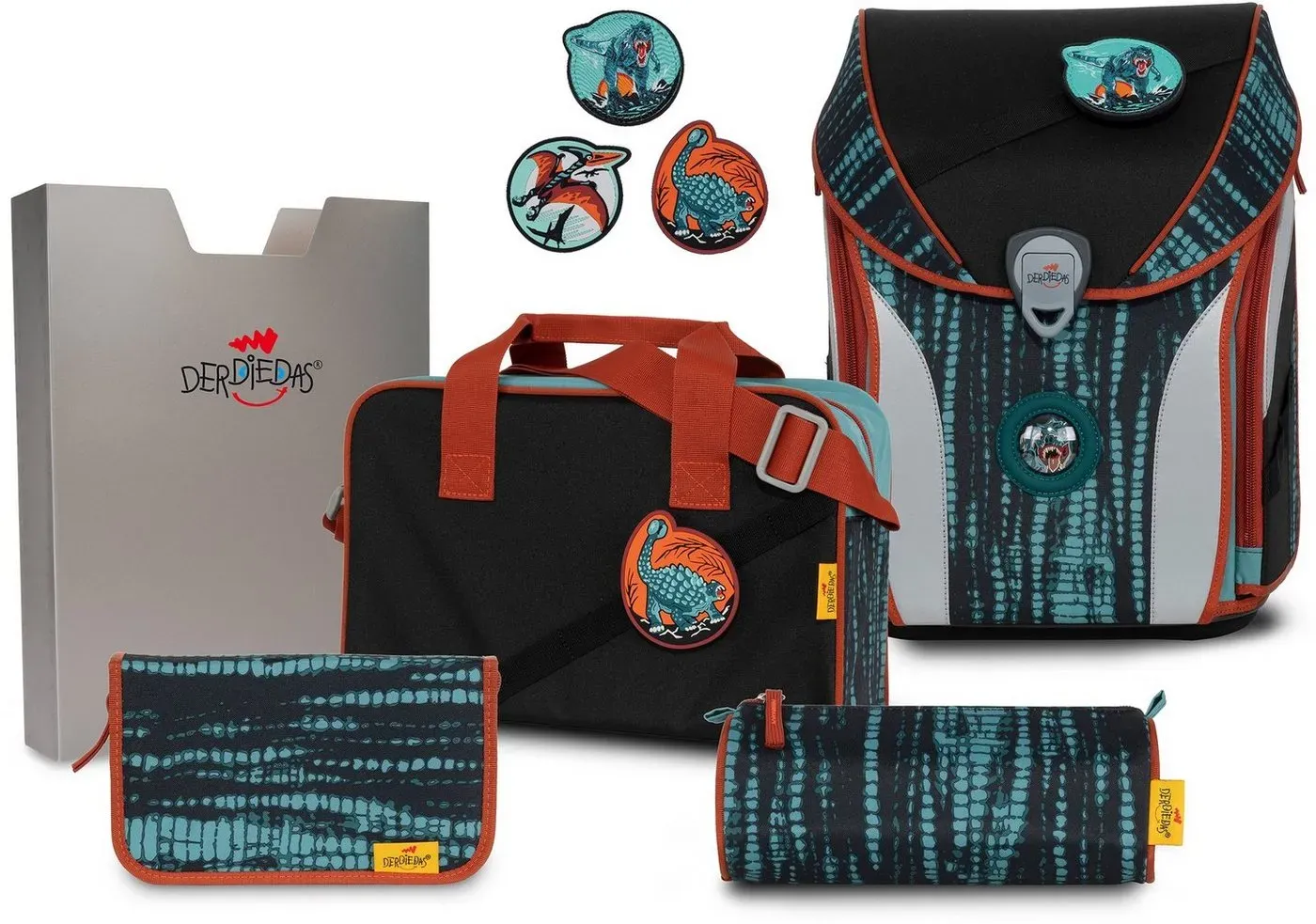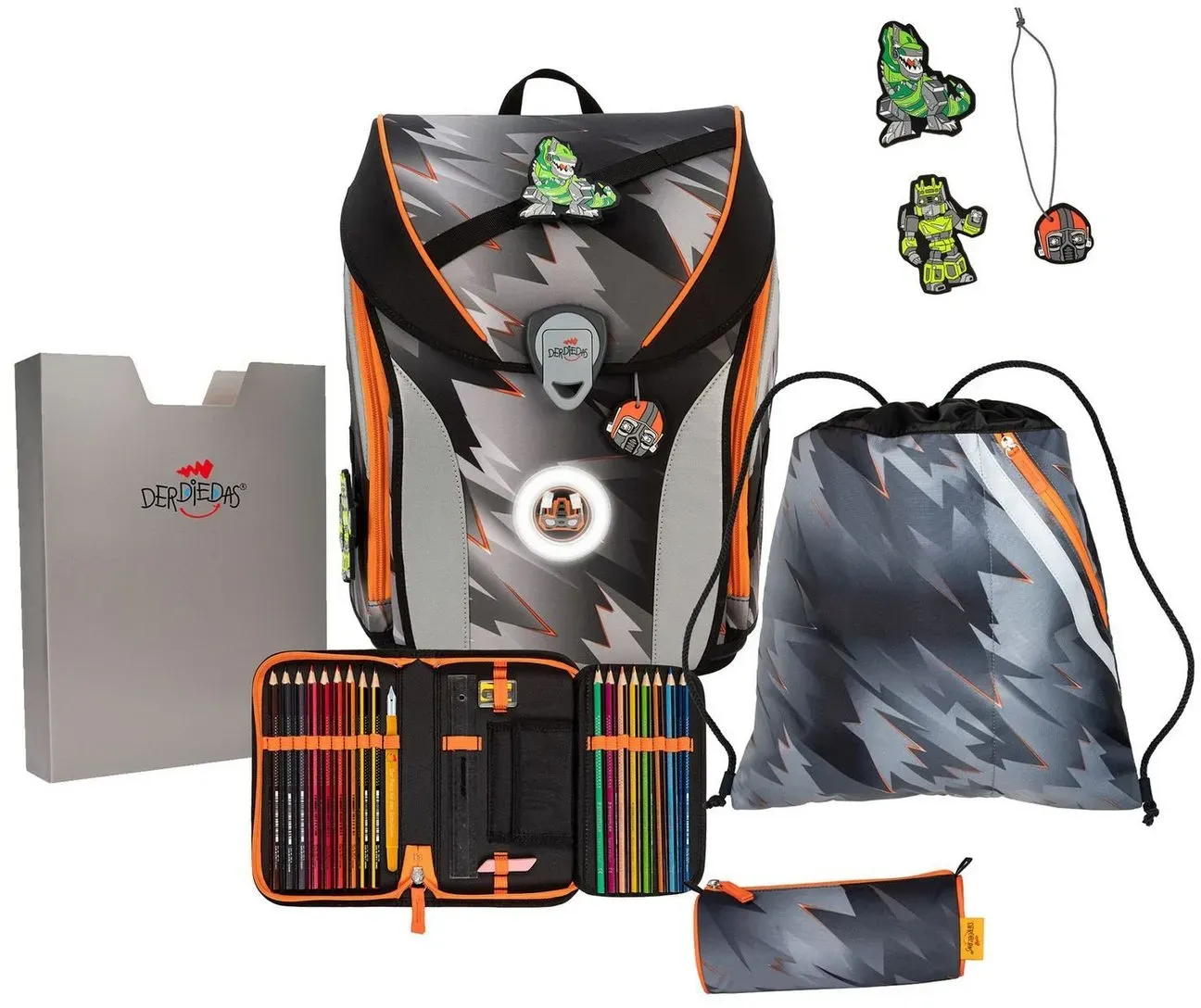 6 Händlerangebote bei billiger.de - Kategorie: Schulranzen - DerDieDas - Produktdetails: Alter: ab n Der Schulranzen ErgoFlex MAX hat eine feste, stabile Form und ein Gewicht von 950 Gramm Mit den Wechselbuttons und Anhängern lässt er sich im Handumdrehen umgestalten Dank seines mehrfach höhenverstellbaren Tragegurtsystems wächst er mit und entlastet den Kinderrücken Die atmungsaktive, ergonomische Rückenpolsterung passt sich optimal an Die gepolsterten Schultergurte aus Mesh in ergonomischer S-Form und der längen- und höhenverstellbare Brustgurt sind ein weiters Plus Der Beckengurt verlagert den Schwerpunkt des Ranzens ergonomisch auf die Hüfte und kann bei Bedarf einfach abgenommen werden Die großen reflektierenden Flächen sorgen für einen sicheren Schulweg Maße & Gewicht: Verpackungsmaße (Länge x Breite x Höhe): 29 x 39 x 25 cm Gewicht: 0,95 kg Material & Pflege: Für DerDieDas Schulranzen werden ausschließlich hochwertige Materialien verarbeitet - sie sind frei von Azofarbstoffen, Cadmium, PCP und allergieauslösenden Farbmitteln Die verwendeten Gewebe sind wasserabweisend und extrem strapazierfähig Schulranzen von DerDieDas sind nicht nur recycelbar, sondern aus recyceltem Material: Außengewebe und Innenfutter sind aus wiederverwerteten PET-Flaschen hergestellt Im Lieferumfang enthalten: Den ErgoFlex MAX gibt es im praktischen Komplett-Set mit Heftebox, Sportbeutel, Faulenzermäppchen, Schüleretui mit Staedtler Qualitätsstiften und je nach Motiv ... Für 230 Euro erhalten Sie das ErgoFlex Max Exklusiv LED 5-tlg. Cyber Dino Set, das mit LED-Beleuchtung für zusätzliche Sicherheit sorgt. ![]() ![]() DerDieDas ErgoFlex Max Exklusiv LED 5-tlg. cyber dino