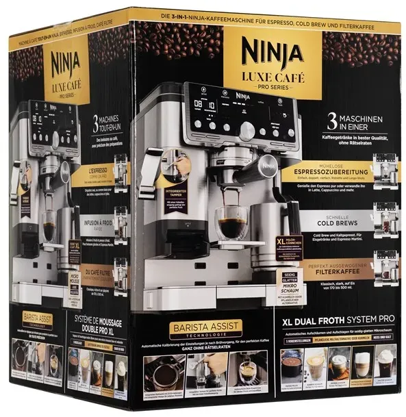Kategorie: Espressomaschinen - Ninja - GTIN:0622356289825 - Entdecken Sie Luxe Caf Pro, die luxuriöse Kaffeemaschine, die Ihnen hilft, Getränke in Caf -Qualität ganz ohne Vorwissen zuzubereiten. Vom Mahlen frischer Bohnen im integrierten Mahlwerk bis zum seidig-glatten Mikroschaum im XL-Milchkännchen werden Sie intuitiv durch jeden Brühvorgang geführt. Füllen Sie einfach frische Kaffeebohnen in den integrierten Bohnenbehälter und wählen Sie Ihre bevorzugte Brühart, ob Espresso, Filterkaffee oder Cold Brew. Die Barista Assist Technology leitet sie mit Mahlgradempfehlungen, gewichtsabhängiger Dosierung und individuellen Brüheinstellungen durch die Zubereitung. Wählen Sie dann aus fünf automatischen Schaumvoreinstellungen für heißen oder kalten Mikroschaum die Maschine nimmt Ihnen die Arbeit ab. Entdecken Sie die All-in-One-Kaffeemaschine, die die Arbeit von drei verschiedenen Geräten übernimmt: Espressomaschine: Genießen Sie Espresso pur oder nutzen Sie ihn als Grundlage für Cappuccino, Latte oder Americano. Filterkaffeemaschine: Wählen Sie aus verschiedenen Brüheinstellungen klassisch, stark oder auf Eis und passen Sie die Getränkegröße individuell von 175 ml bis 530 ml an. Cold-Brew-Maschine: Genießen Sie schnell zubereiteten Cold Brew und katgepressten Kaffee ideal für die Zubereitung von Eiskaffee oder Espresso-Martini. Barista Assist Technology übernehmen Sie so viel Kontrolle über die Kaffeezubereitung, wie Sie möchten. Möchten Sie Ihre Barista-Künste verfeinern? ... Dieses Angebot bietet die 3-in-1 Kaffeemaschine mit Mahlwerk und Milchaufschäumer zu einem guten Preis. ![]() ![]() Ninja Luxe Pro 3-in-1 Kaffeemaschine mit Mahlwerk und Milchaufschäumer für Latte, Cappuccino, Cold Brew & Espresso, einfach zu bedienen, 5 Aufschäumprogramme, silber, ES701EU