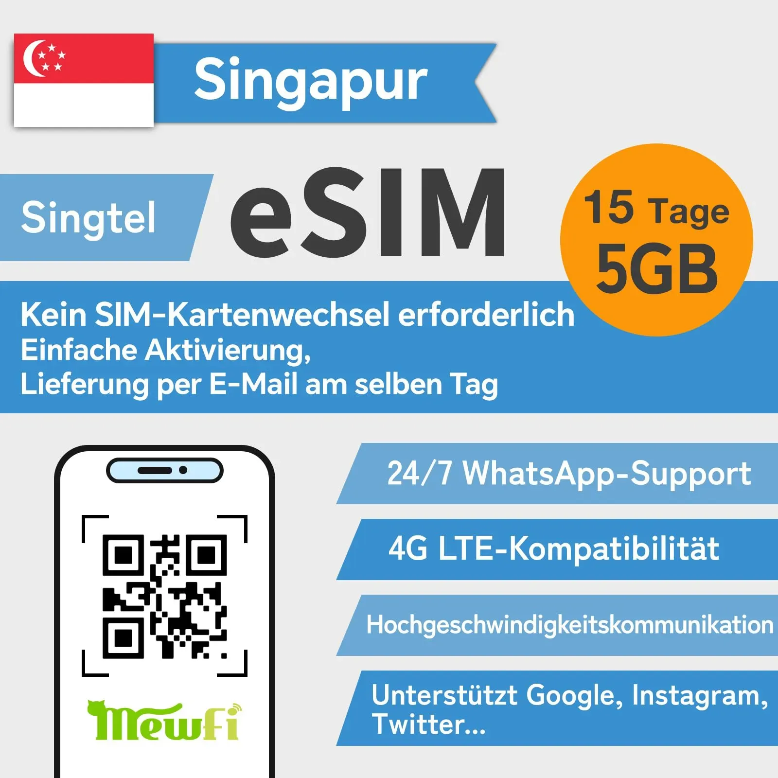 Kategorie: USB-Kabel & Adapter - tsim - Highspeed-5G/4G-Daten: Genießen Sie bis zu 3GB schnelles 5G/4G-Internet. Hotspot-Tethering wird unterstützt. Aufladbar über die InstaSIM-App: Verwalten Sie Ihren Tarif ganz einfach und laden Sie Daten jederzeit über die InstaSIM-App nach so müssen Sie sich keine Sorgen machen, dass Ihnen die Daten ausgehen! ERHALTEN SIE IHRE eSIM INNERHALB VON 24 STUNDEN: Ein QR-Code wird 24 Stunden nach Versand generiert und an Ihre bei Amazon registrierte E-Mail-Adresse gesendet Sie müssen nicht auf Ihr Paket warten. Holen Sie sich einfach den QR-Code unter www.tsim.mobi/get-qr-code, geben Sie Ihre Bestellnummer ein und legen Sie sofort los. Die URL ist ebenfalls im Paket enthalten. Scannen Sie einfach den QR-Code oder tippen Sie auf dem iPhone auf den bereitgestellten Link, um Ihre eSIM zu installieren. KOMPATIBILITäT: Dies ist eine reine Daten-eSIM ohne Telefonnummer. Sie erfordert eSIM-fähige Telefone wie das iPhone 12+ oder Android 2021+. 24/6 Mehrsprachiger Support: Erhalten Sie Unterstützung in mehreren Sprachen per Telefon, E-Mail oder InstaChat, von Montag bis Samstag. Die Kontaktdaten sind in der SIM-Karten-Verpackung enthalten. - 7,49 Euro bei Amazon Marketplace CE - gefunden von billiger.de Dieses Angebot bietet eine praktische eSIM für Singapur mit einfacher Aktivierung und 24/7 WhatsApp-Support für Reisende. ![]() ![]() mewfi eSIM für Singapur Einfache Aktivierung &24/7 Whatsapp-Support 4G High-Speed-Kommunikation,unterstützt Google,Ins,Twitter... für eSIM-kompatible entsperrte Smartphones