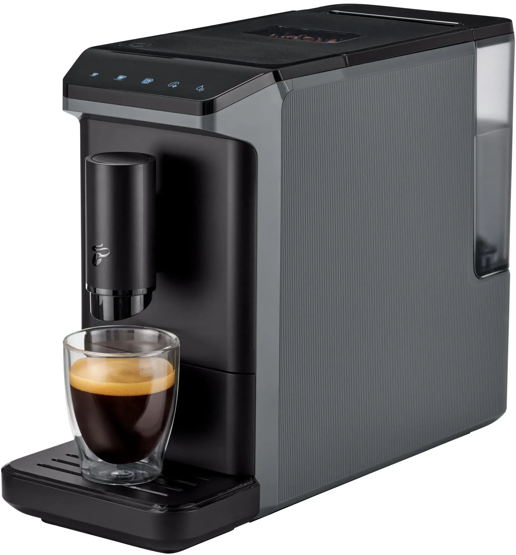 3 Werktagen in_stock - Kaffeekocher Vollautomatische Kaffeevollautomaten Haushalt & Wohnen Kaffee- und Espressomaschinen - EAN:4061445373193 - Tchibo Esperto Mini Kaffeevollautomat Bereits Seit Über 3 n Stellen Die Kaffeeexperten*innen Von Tchibo Kaffeemaschinen Her. Auch Bei Diesem Vollautomaten Ist Jede Tasse Speziell Auf Tchibo Kaffees Abgestimmt - Ein Ideales Zusammenspiel Zwischen Mahlgrad, Wassermenge, -Temperatur Und Druck. Mit Seinem Hochwertigen Design Und Seiner Platzsparenden Form (Nur 16 Cm Breit!) Macht Dieses Platz-Leistungswunder In Jeder Noch So Kleinen Küche Sowohl Für Einsteiger Als Auch Für Enthusiasten Eine Gute Figur! Der Esperto Mini Überzeugt Mit Neuer Vielfalt Im Kleinsten Format Und Zaubert Wahlweise Intensiven Espresso, Klassischen Caffè Crema Oder Großen Xl Caffè Crema Für Jeden Geschmack. Für Kräftigeren Kaffeegenuss Kann Die Kaffeestärke Dank Der intense+-Technologie Angepasst Werden. Der Transparente Bohnenbehälter Bietet Mit Seiner Silikonabdichtung Frische Für Bis Zu 150 G Kaffeebohnen. Zudem Stellt Der Qr-Code Auf Der Rückseite Eine Digitale Servicewelt Bereit, Für Mehr Service Und Hilfe. Ein Hochwertiges Edelstahlkegelmahlwerk Und Eine Einfache Reinigung Dank Entnehmbarer Brühgruppe Und Automatischem Entkalkungsprogramm Machen Den Vollautomaten Einfach Zu Pflegen Und Langlebig. - gefunden von Kelkoo Das graue Modell ist hier direkt bei tchibo.de zu einem sehr guten Preis erhältlich. ![]() Tchibo - Esperto mini Kaffeevollautomat - grau