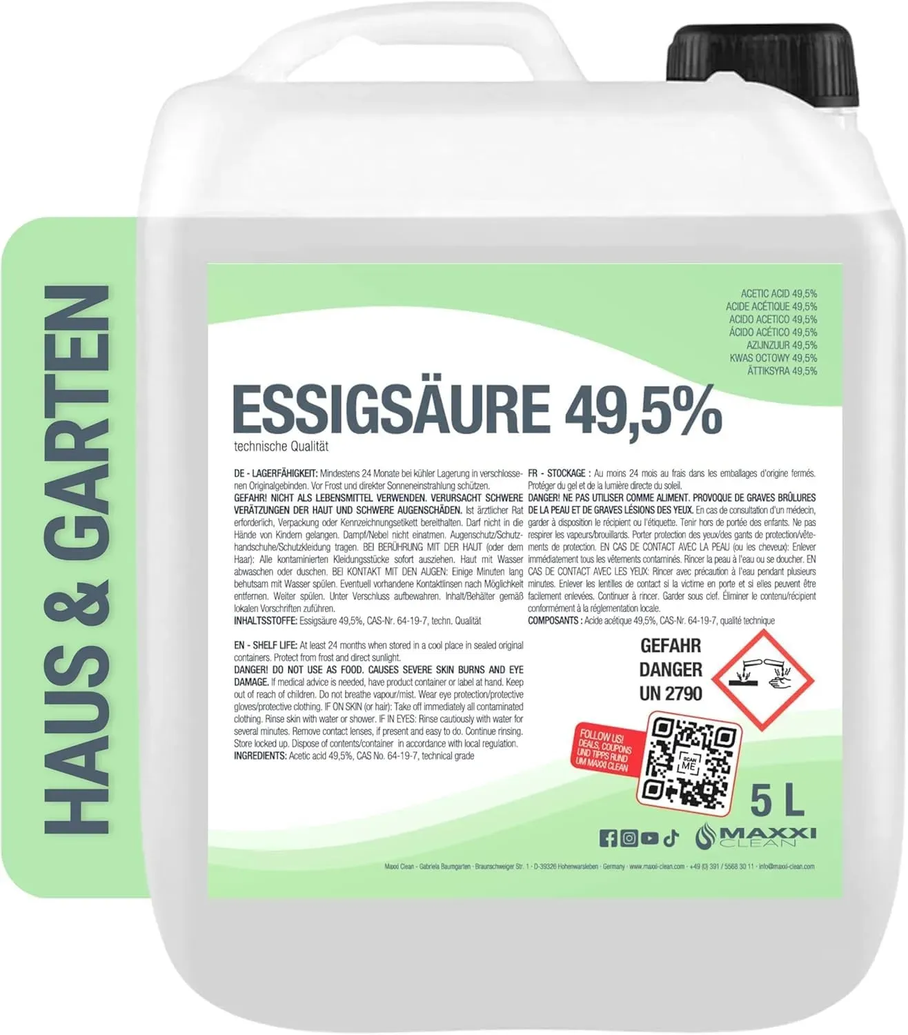 Zustand: Neu - 3,30 € / l - Spezialputzmittel - Maxxi Clean - 1472 - EAN: 4251435903206 - ðŸ›¢ï¸ Große Menge: 5 Liter Vorrat - perfekt für langfristigen Gebrauch und große Projekte. 🌟 Vielseitig einsetzbar: Effektiv zum Entkalken, Reinigen und als Konservierungsmittel einsetzbar. 🌠Umweltfreundlich: Biologisch abbaubar und umweltschonend - eine natürliche Alternative zu chemischen Reinigern. œ Hochwertige Qualität: Hergestellt nach strengen Qualitätsstandards - rt zuverlässige und sichere Anwendung. - Verkäufer: Maxxi Brands im amazon.de Marketplace ![]() ![]() MAXXI CLEAN | 5 l Essigsäure 49,5% | Ideal als Reiniger und Entkalker | Für Haus und Garten | Essigsäure in Premium Qualität Made in Germany