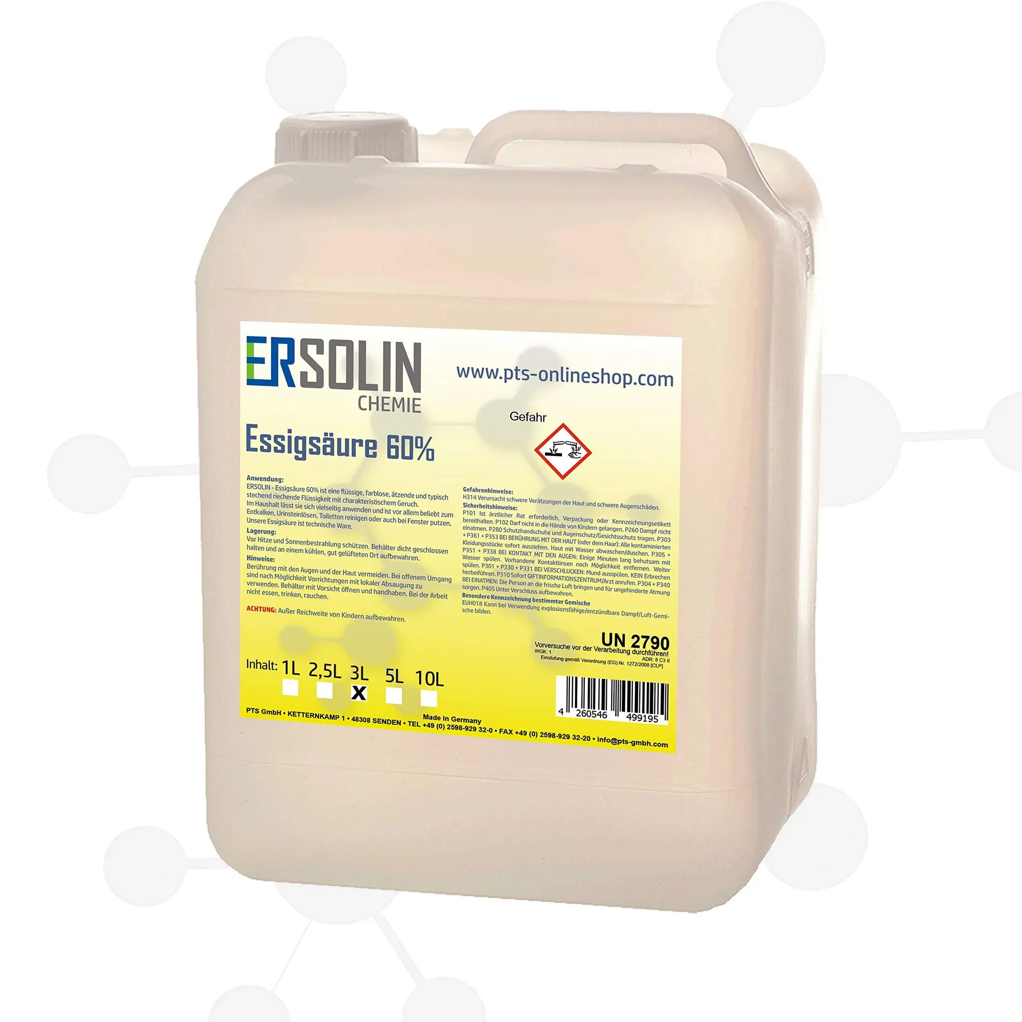 Kategorie: Reinigungsmittel - ERSOLIN - GTIN:4260546499195 - farblos, klar - technischer Qualität Hausmittel zum Lösen von Urinstein Für viele Reinigungszwecke und zum Entkalken geeignet Nicht zum Verzehr geeignet Im Haushalt vielseitig anwendbar ACHTUNG: Außer Reichweite von Kindern aufbewahren. - 15,98 Euro bei Amazon Marketplace Health & Personal Care - gefunden von billiger.de ![]() ![]() 2x1L Essigsäure 60% Premium Qualität Essigessenz (2L)