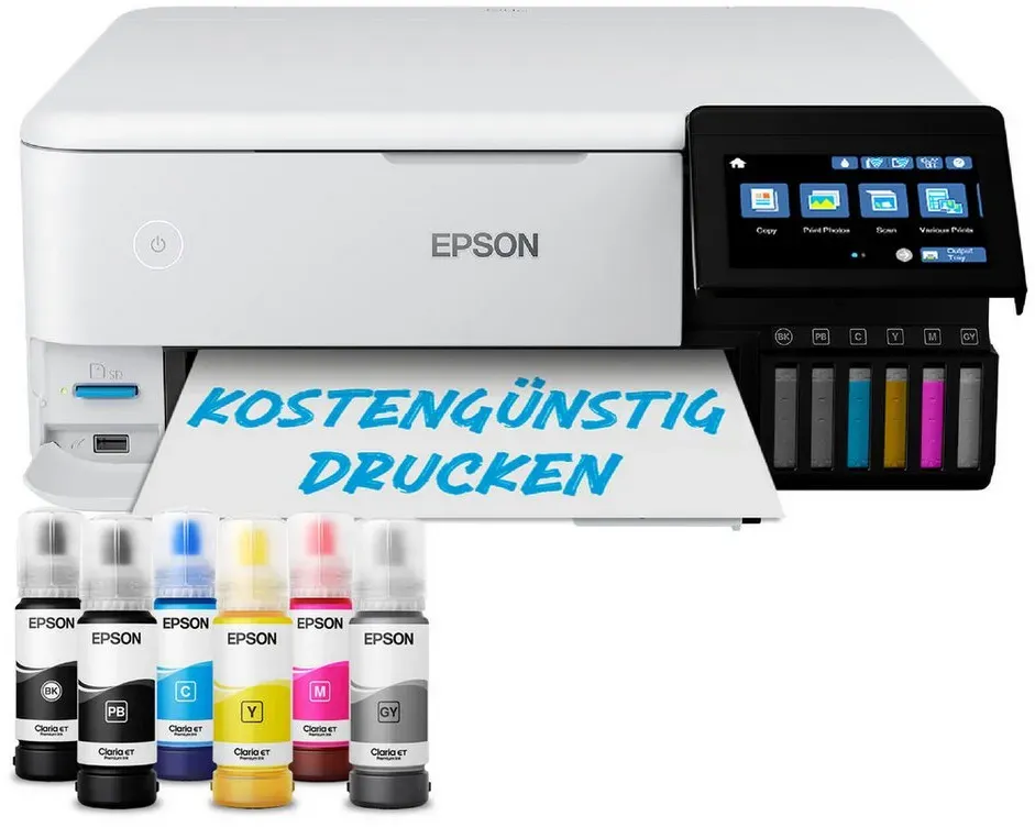 34 Händlerangebote bei billiger.de - Kategorie: Multifunktionsdrucker - Epson - 6-Farben-Tintentanksystem - Epson Claria Premium-Tinten für EcoTank erzeugen hochwertige und langlebige Fotos bis DIN A4 sowie herausragende Schwarzweiß-Fotos mit der neuen grauen Fototinte. Die schwarze Pigmenttinte eignet sich ideal zum Drucken von gestochen scharfem Text auf Normalpapier. Zeit- und Geldersparnis - Mit diesem kostengünstigen Drucker können Sie mit nur einem Satz Tintenflaschen bis zu 2.300 hochwertige Fotos drucken*. Die Tintenflaschen und Tintentanks sind so konzipiert, dass sie einfach zu handhaben sind, wenn es Zeit ist, die Tintentanks nachzufüllen. Moderne Vielfalt - Mit umfassender Wi-Fi, Wi-Fi Direct und Ethernet-Konnektivität können Sie diesen Drucker problemlos in Ihre vorhandene Konfiguration integrieren. über den 10,9 cm großen Farb-Touchscreen können Sie auch von SD-Karten und USB-Sticks aus drucken. Kompatibilität mit künstlerischen Medien - Der ET-8500 verfügt über Papierfächer für Fotogröße und A4 auf der Vorderseite und kann direkt auf geeignete CDs/DVDs drucken. Das hintere Fach nimmt Spezialmedien wie Bastelpapier und Karton auf, während der gerade A4-Papiereinzug ermöglicht, dass Sie auf Medien mit einer Dicke von bis zu 1,3 mm und einer Länge von 2 m drucken können! Epson Smart Panel-App - Mit dieser App können Sie Ihren Drucker über Ihr Smart-Gerät bedienen*. Drucken Sie Fotos, kopieren Sie Dokumente, richten Sie Ihren Drucker ein, beheben Sie Fehler und ... Dieses Angebot von Galaxus.de für 512.9 Euro ist preislich sehr attraktiv und bietet den Drucker mit Tintentank-System. ![]() ![]() Epson EcoTank ET-8500 (Tintentank, Farbe) (C11CJ20401)