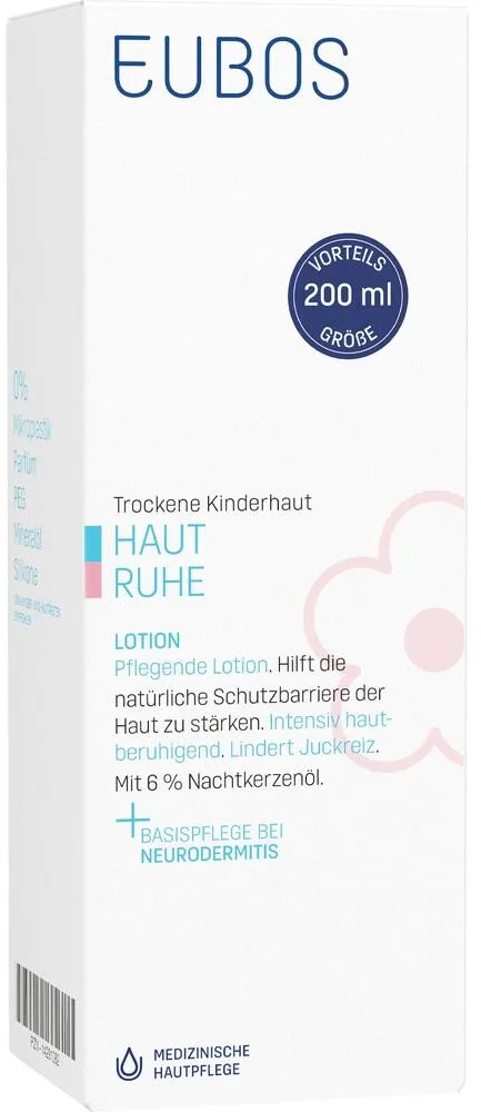 EUBOS - EAN: 4021354008487 - HAUT RUHE LOTION enthält 6 % wertvolles Nachtkerzenöl mit den essenziellen Fettsäuren Linolsäure und gamma-Linolsäure, die sehr wesentlich für den Aufbau der natürlichen Barrierefunktion der Haut sind und bei Neurodermitis häufig aufgrund eines... - bei shop-apotheke.com - aus Yadore Produktdaten ![]() Eubos Kinder Haut Ruhe Lotion 200 ml