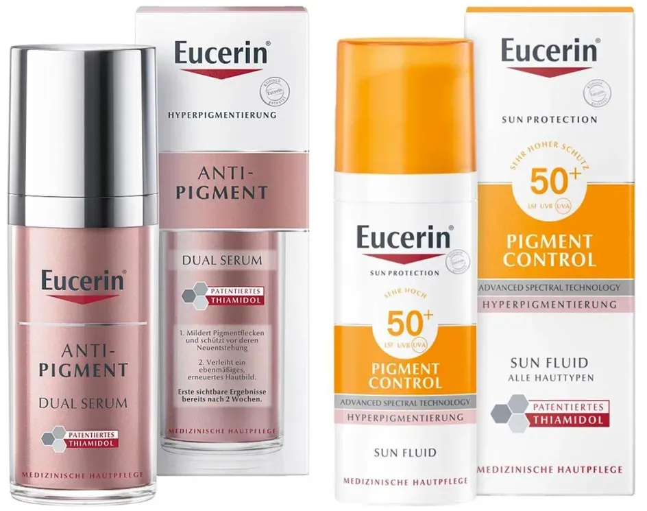 7 Händlerangebote bei billiger.de - Kategorie: Medizinische Körperpflege - Eucerin - Anwendungsgebiet von Eucerin Anti-Pigment Dual Serum + Sun Pigment Control Face Fluid LSF 50+Das Eucerin Anti-Pigment Dual Serum €“ Gegen Pigmentflecken (30 ml) mit dem Einkammer-Spender wirkt mit patentiertem Thiamidol®, das Pigmentflecken und sogenannte Altersflecken am Ursprung bekämpft, diese nach und nach mildert sowie bei regelmäßiger Anwendung verhindert, dass neue Pigmentflecken entstehen. Zusätzlich enthält die Gesichtspflege Hyaluronsäure, die der Haut intensive Feuchtigkeit spendet. Beide Texturen sind leicht und ziehen schnell ein €“ für ein strahlenderes Aussehen und einen ebenmäßigeren Hautton. Erste Ergebnisse sind schon nach 2 Wochen sichtbar und verbessern sich bei kontinuierlicher Anwendung stetig weiter. Die sehr gute Hautverträglichkeit und die Wirksamkeit des Serums ist klinisch und dermatologisch erwiesen. Der Vorgänger dieses Produktes ist das Dual-Serum mit Doppelkammer-System. Das neue Spendersystem vereint die Wirkstoffe in einer einzigen Kammer und ist damit noch komfortabler in der Anwendung. Eucerin Sun Pigment Control Face Fluid LSF 50+ (50 ml) €“ Sehr hoher Sonnenschutz & sichtbare Milderung von vorhandenen Pigment- und Altersflecken. Das Eucerin Pigment Control Face Sun Fluid LSF 50+ bietet einen sehr hohen Sonnenschutz für das Gesicht, reduziert effektiv dunkle Flecken und verhindert deren Wiederauftreten. Mit der Advanced Spectral ... Dieses umfangreiche Set bietet eine komplette Anti-Pigment Routine mit Tages-, Nachtpflege und Dual Serum für maximale Wirksamkeit. ![]() ![]() Eucerin Anti-Pigment Tag LSF 30 50 ml + Nachtpflege 50 ml + Dual Serum 30 ml