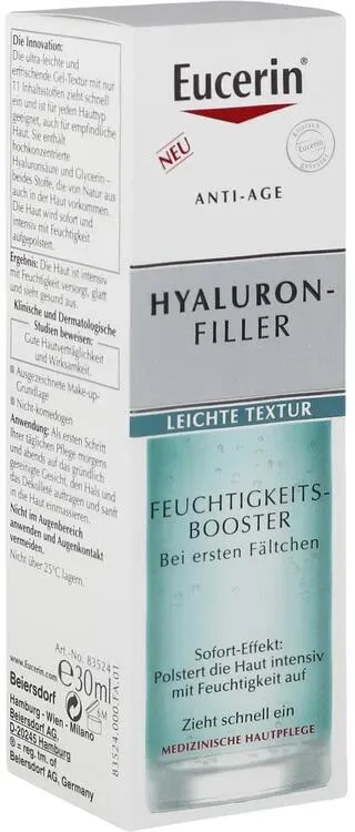 Eucerin - EAN: 4005800260261 - Der Eucerin HYALURON-FILLER Feuchtigkeits-Booster ist ein ultra-leichtes und erfrischendes Gel, das die Haut sofort aufpolstert und intensiv mit Feuchtigkeit versorgt. Die Formel mit nur wenigen Inhaltsstoffen kombiniert Hyaluronsäure mit Glycerin. Beides sind natürliche Stoffe, die auch in der Haut vorkommen, um die Haut mit Feuchtigkeit zu versorgen. Klinische und dermatologische Studien zeigen ausgezeichnete Ergebnisse. 100 % der Probanden/Testpersonen bestätigten, dass das Produkt Feuchtigkeit spendet , die Haut sofort mit Feuchtigkeit versorgt und sichtbar aufpolstert . Der Booster ist für alle Hauttypen geeignet, auch für empfindliche Haut. Er zieht schnell ein und hinterlässt ein glattes Hautgefühl und ein gesundes Aussehen.Anwendung: Erster Schritt Ihrer täglichen Pflege. Morgens und abends auf das gereinigte Gesicht, Hals und Dekollet auftragen. Sanft in die Haut einmassieren, die empfindliche Augenpartie aussparen und direkten Augenkontakt vermeiden.Struktur und Aussehen der Haut verändern sich im Laufe der Zeit, meist beginnend mit feinen Fältchen und Falten. Später beginnt die Haut zu erschlaffen, verliert an Volumen und die Gesichtskonturen verschwimmen zunehmend. Bei fortgeschrittener Hautalterung nimmt Anzahl und Tiefe der Falten zu, gleichzeitig nehmen Elastizität, Festigkeit und Ausstrahlung ab.Eucerin, Experte für Hyaluron in der Apotheke, bietet mehr als nur Hyaluron: HYALURONplus. HYALURONplus kombiniert die Vorteile von ... ![]() ![]() Eucerin Anti-Age Hyaluron-Filler Feuchtigkeits-Booster Nacht