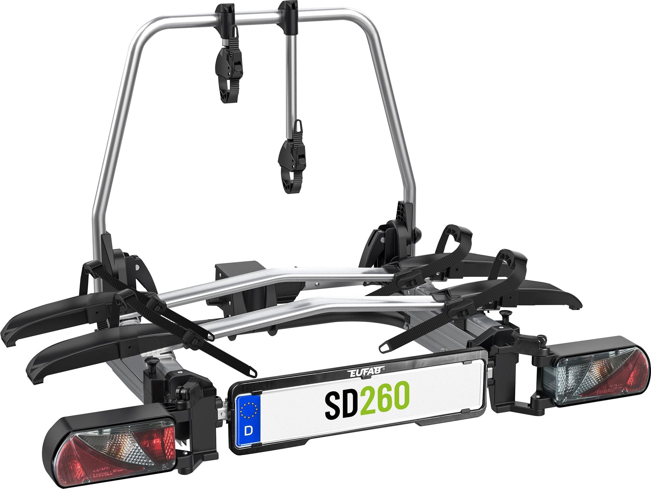 Eufab - EAN: 4049376115969 - Art.-Nr. 11596 /// SD260 Flügeltür Kupplungsträger Zum Transportieren von Fahrrädern auf der Anhängerkupplung speziell für Kastenwagen und Wohnmobile, Familienbusse, Hochdachkombis mit Flügeltüren sowie PKWs. Gleitschienen mit ca. 70cm Schiebeweg ermöglicht die öffnung von bis zu ca. 85cm breiten Türen. Einfache Montage mit Schnellverschluss-System. Die Räder werden mit abnehm- und abschließbaren Strap-Rahmenhaltern mit Ratsche befestigt. Der SD260 ist ausgelegt für den Transport von zwei Fahrrädern. Dabei macht er keinen Unterschied, ob das Fahrrad einen normalen, Oversize oder Y-Rahmen hat. Auch schwere E-Bikes werden problemlos transportiert. Der Träger ist zusammenklappbar. Merkmale und technische Details: Ausziehbar: Gleitschienen mit ca. 70cm Schiebeweg ermöglicht die öffnung von bis zu ca. 85cm breiten Türen Zum Transportieren von 2 Fahrrädern auf der Anhängerkupplung.Schnellverschluss: JaBefestigung der Fahrräder: Abnehm- und abschließbare Strap-Rahmenhalter mit Ratsche, Spanngurte mit RatscheAbschließbarVormontiertE-Bike geeignetMax. Nutzlast: 60 kgEigengewicht: Ca. 20,5 kgSchienenart: Stabile Aluminiumschienen mit KunststoffradhalterungSchienenabstand: Ca. 24 cmRadstand: Max. 130 cmMax. Reifenbreite in der Schiene: Bis 3,25 ZollBeleuchtungsanschluss: 13-poliger SteckerMaterial: Aluminium / Kunststoff / StahlRahmenhalter speziell für empfindliche RahmenEinfache und schnelle Montage mit Schnellverschluss-SystemAuch für Fahrräder mit ... Dieses Angebot ist mit 545 Euro eines der günstigsten für den Eufab SD260 und somit ideal für preisbewusste Käufer. ![]() EUFAB 2-FAHRRAD PLATTFORM SD260 FAHRRADTRäGER FüR TRANSPORTER MIT FLüGELTüREN farblos grau No Size