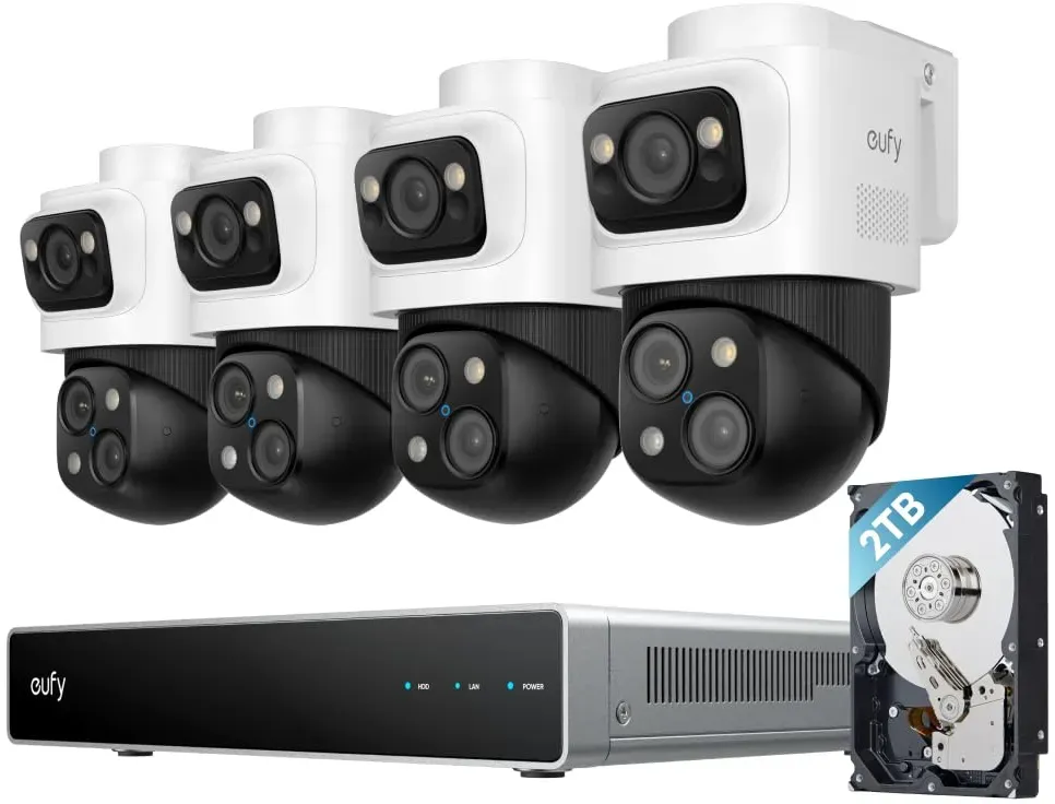 eufy - EAN: 0194644293321 - 3-Linsen Bullet-PTZ-Kamera: Oben erfasst die 4K Weitwinkelkamera mit 16MP und 122 Blickwinkel das gesamte Geschehen, unten sorgt die 2K PTZ-Kamera mit 360 -Schwenk und 8 Zoom für lückenlose Rundumsicht. Auto-Framing & Gruppen-Tracking: Erkennt die... - bei eufy.com - aus Yadore Produktdaten ![]() ![]() eufy PoE NVR Security System S4 Max, 4× 3-Linsen Bullet-PTZ-Kameras, 16MP, 360° PTZ, 8× Auto-Zoom, KI-Videosuche, Multi-Kamera Tracking, rot-blaues Stroboskop, Farbnachtsicht, 24/7 Aufnahme, 2TB HDD