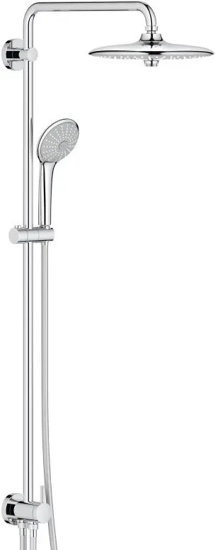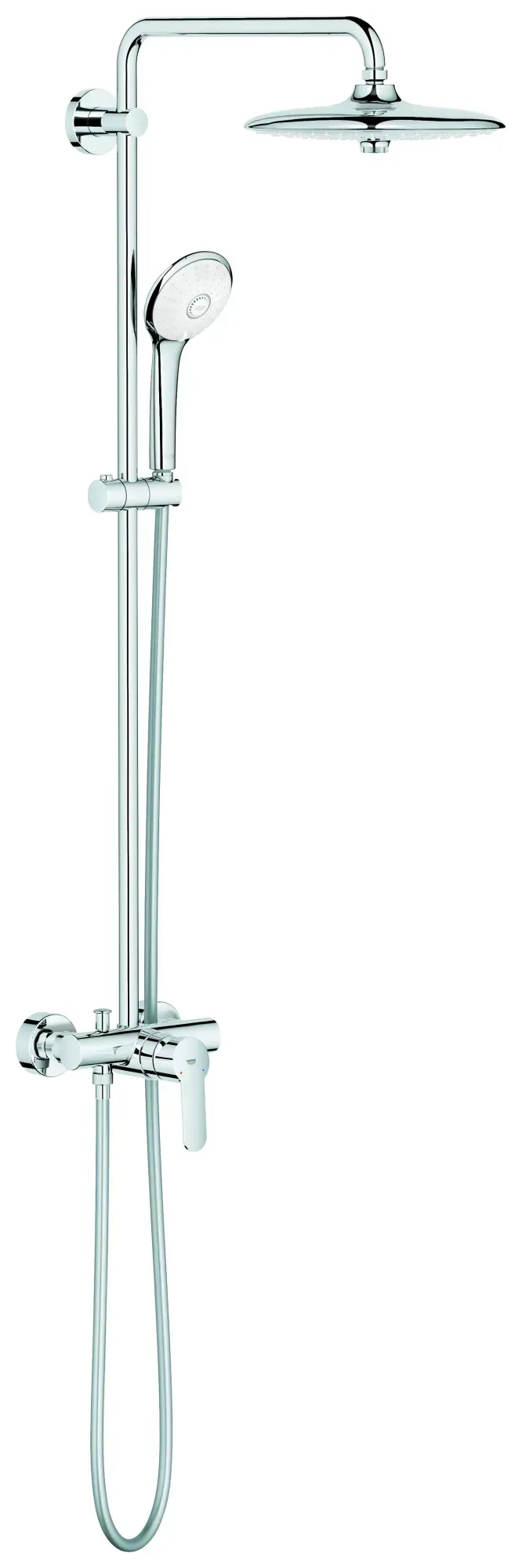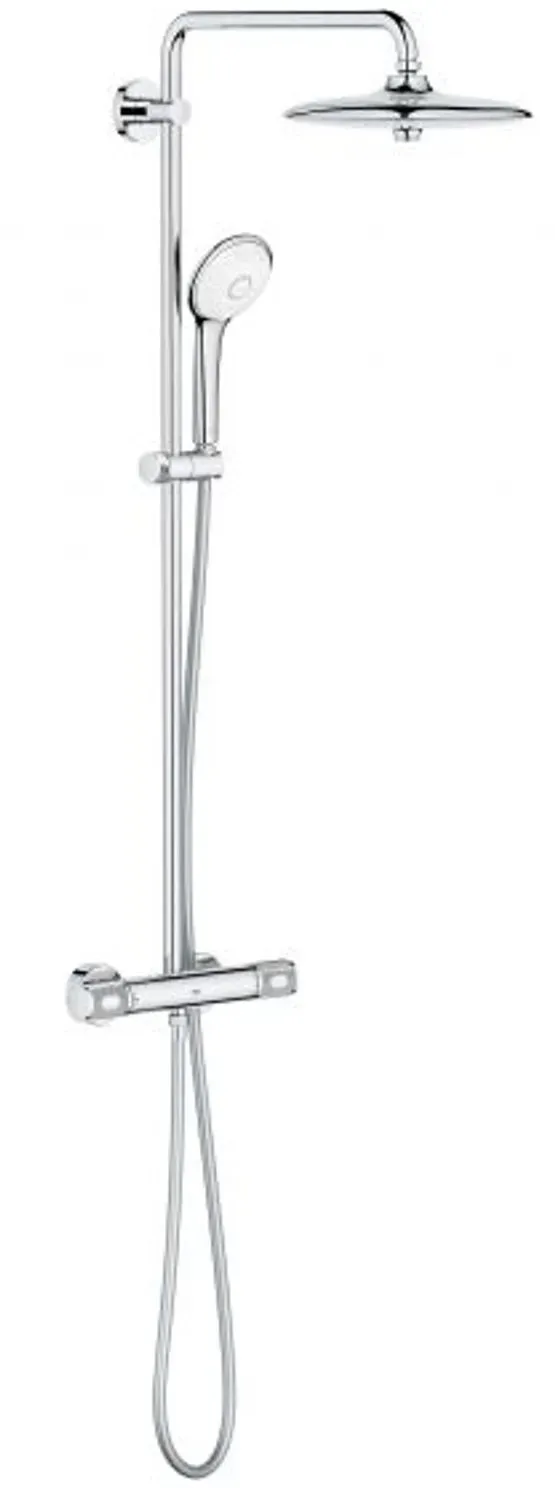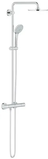 348.9 / 1.000 Stück - Kategorie: Brausegarnituren - Grohe - GTIN:4005176647895 - Euphoria System 260Duschsystem mit Einhandmischer für die Wandmontagebestehend aus:horizontal schwenkbarer 450 mm DuscharmAufputz-Einhand-Brausebatterie mit Umstellungermöglicht den Wechsel zwischen:Euphoria 260 Kopfbrause (26 457)3 Strahlarten:Rain, SmartRain, Jetmit Kugelgelenk, Drehwinkel 15 Handbrause Euphoria 110 Massage (27 239)3 Strahlarten:Rain / Massage / SmartRainin der Höhe verstellbar mittels GleitelementBrauseschlauch Silverflex 1.750 mm (28 388)GROHE SilkMove 46 mm KeramikkartuscheGROHE DreamSpray Perfektes StrahlbildGROHE Long-Life OberflächeGROHE SprayDimmer stufenlose Reduktion der DurchflussmengeGROHE Water Saving 9,5 l/min DurchflusskonstanthalterGROHE FastFixation obere Konsole variabelinnenliegende separate WasserführungSpeedClean Antikalk-SystemTwistStop gegen Verdrehen des Brauseschlauchsfür Durchlauferhitzer ab 18 kW/h geeignetMindestdurchfluss 7 l/minSerie / Kollektion: Euphoria 260Modell: 27473_2Typ: DuschsystemAnschluss: Außengewinde Durchflussmenge (max.): 8,5 l/minBeleuchtung: nein Anschlussdurchmesser: 1/2 Temperaturregelung: manuelle Bedienung Abmessungen:Breite: 150 mmHöhe: 1149 mmTiefe: 472 mmDurchmesser &8960: 260 mm - 348,90 Euro bei gerabad.de - gefunden von billiger.de Mit 469.9 Euro ist dieses Duschsystem eine gute Mittelklasse-Option mit AP-Thermostat und schwenkbarem Arm. Contorion. de