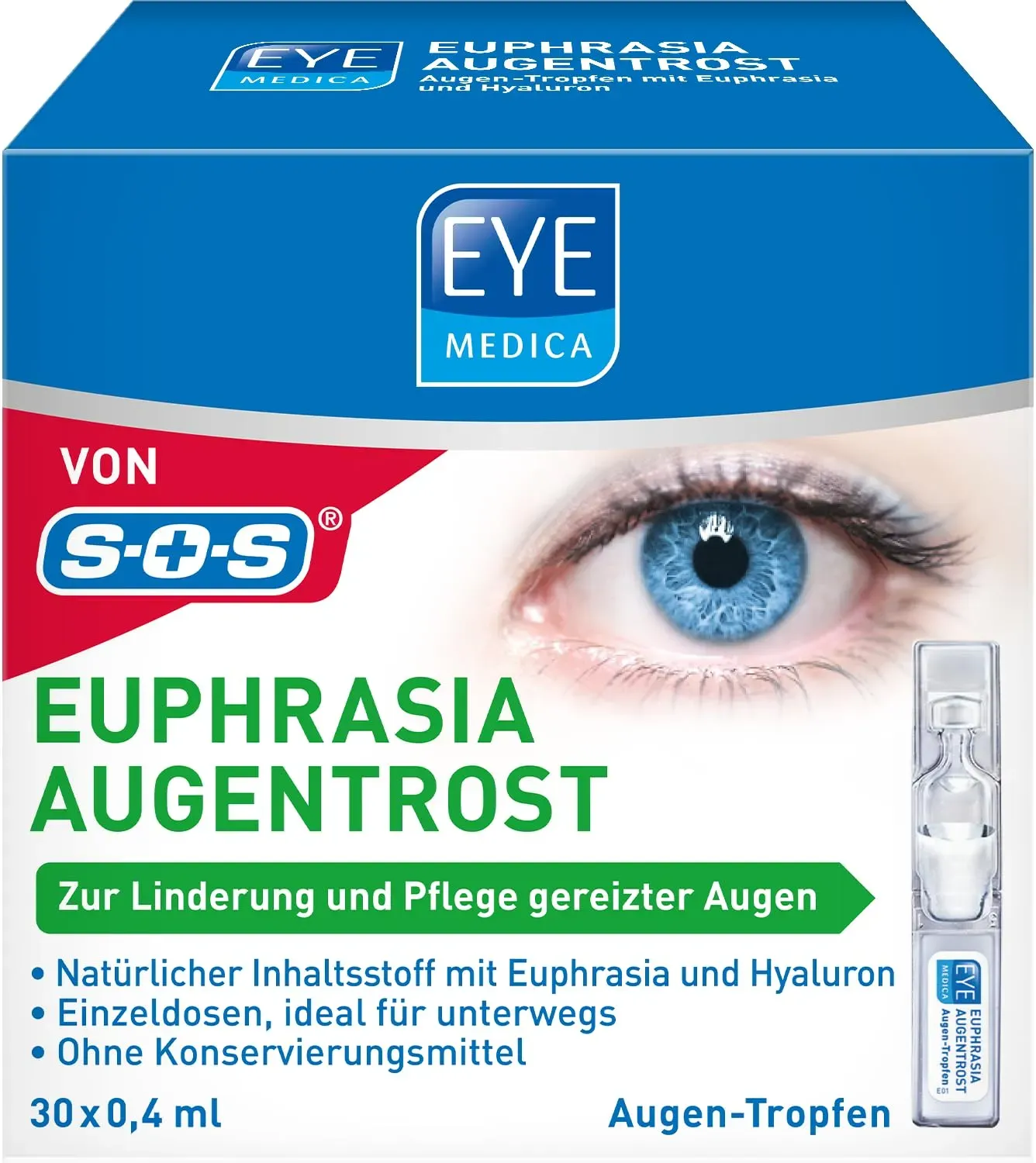 Auf Lager Versand durch AmazonEyeMedica Euphrasia Augentropfen gegen trockene Augen und gereizte Augen, Befeuchtung, Linderung und Pflege, mit Hyaluron, 30 x 0,4 ml Einzeldosen