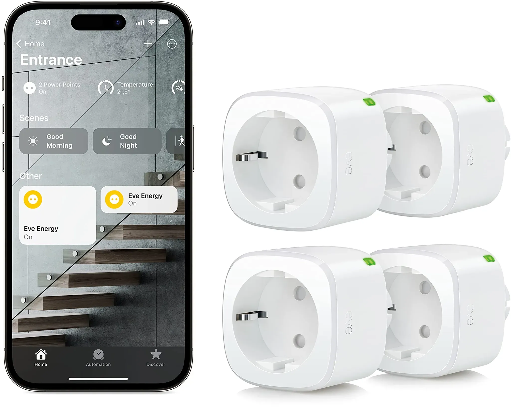 EVE - EAN: 4260195391277 - Alle Vorteile des Eve Energy Matter 4er-Set im überblick: Intuitive Installation Automatisierung Datenanalyse Ende-zu-Ende-Verschlüsselung Energieeffizient Mit Matter-Unterstützung - bei tink.de - aus Yadore Produktdaten ![]() ![]() Eve Energy (Matter) 4er Set ? Smarte Steckdose, TÜV-zertifiziert, Stiftung Warentest, Matter & Thread, funktioniert mit Apple Home, Alexa, Google Home, SmartThings, Thread Border Router erforderlich