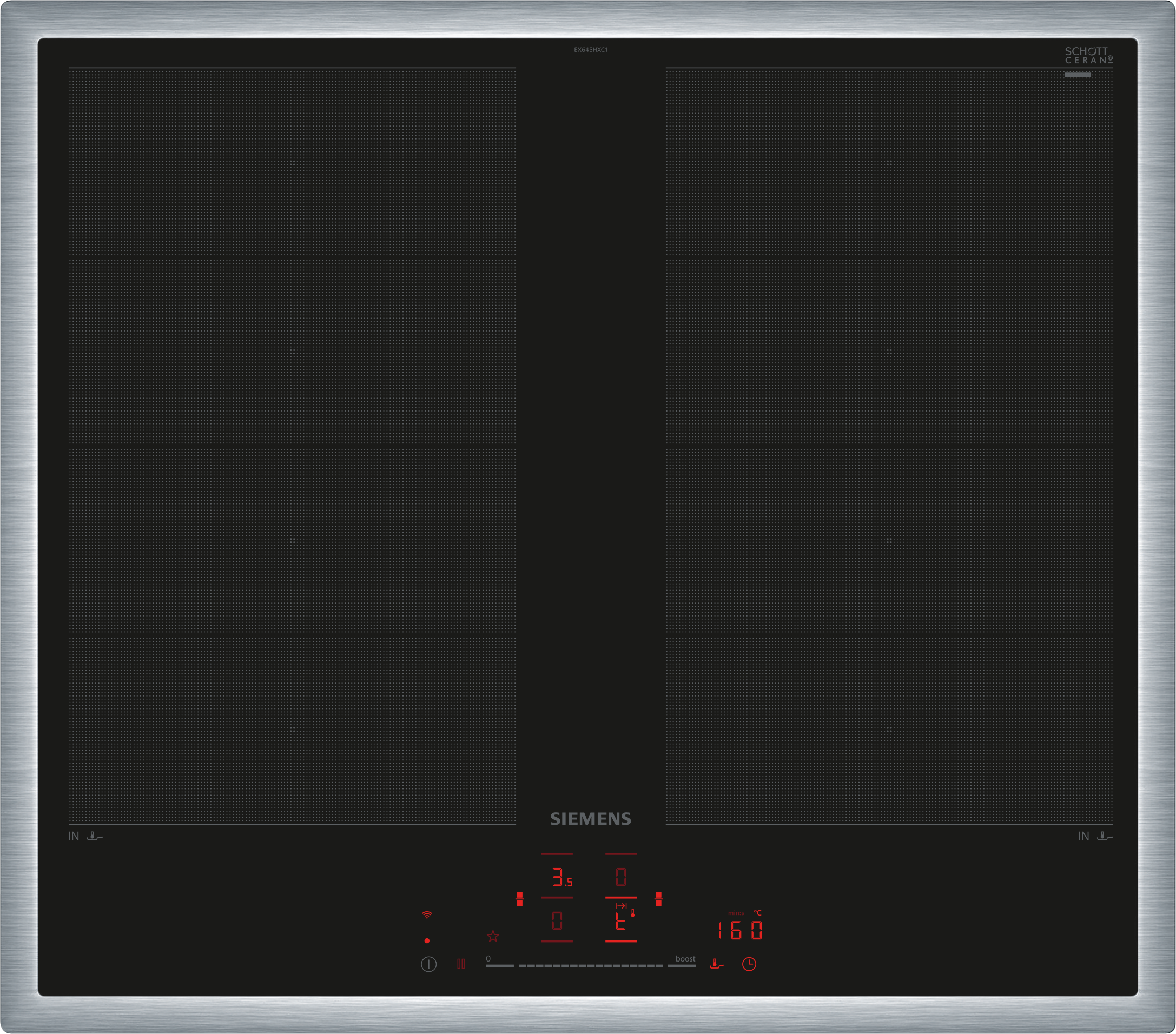 Lieferung in 3-7 WerktagenSiemens EX645HXC1E Induktionskochfeld 60cm touchSlider Bratsensor varioInduktion HomeConnect Edelstahlrahmen