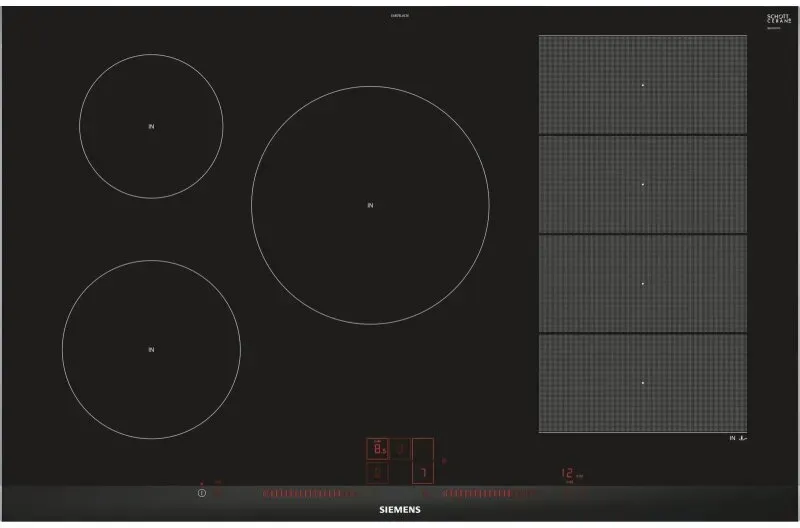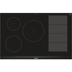 Kategorie: Kochfelder - Siemens - GTIN:4242003717004 - * 80 cm: Platz für 5 Töpfe () oder Pfannen ()Flexibilität der Kochzonen * 1 varioInduktions-Kochzone: Verwenden Sie Kochgeschirr beliebiger Form und Größe innerhalb der 40 cm langen Zone. * Kochzone vorne links: 180 mm, 1.8 kW (maximale Leistung 3.1 kW) * Kochzone hinten links: 145 mm, 1.4 kW (maximale Leistung 2.2 kW) * Kochzone hinten: 240 mm, 2.2 kW (max. Leistung 3.7 kW) * Kochzone hinten rechts: 210 mm, 200 mm, 2.2 kW (maximale Leistung 3.7 kW) * Kochzone vorne rechts: 210 mm, 200 mm, 2.2 kW (maximale Leistung 3.7 kW)Benutzerfreundlichkeit * Dual LightSlider-Bedienung: Steuern Sie die Leistung direkt über die beiden beleuchteten Touchleisten (im ausgeschalteten Zustand unsichtbar). * 17 Leistungsstufen: Stellen Sie die Hitze mit 17 Leistungsstufen (9 Hauptstufen und 8 Zwischenstufen) präzise ein. * Warmhaltefunktion: Warmhalten von Speisen bei voreingestellter niedriger Leistungsstufe. * Timer mit Abschaltfunktion: Schaltet die Kochzone am Ende der eingestellten Zeit aus (z. B. bei gekochten Eiern). * Timer: Am Ende der eingestellten Zeit ertönt ein Signal (z. B. beim Pastakochen). * Laufzeitanzeige: zeigt an, wie viel Zeit seit dem Starten des Timers vergangen ist (z. B. beim Kochen mit Kartoffeln).Zeitersparnis und Effizienz * powerBoost-Funktion für alle Induktions-Kochzonen möglich: Mit 50 % mehr Leistung z. B. Wasser schneller zum Kochen bringen als auf höchster Leistungsstufe. * powerBoost-Funktion für ... ![]() Siemens iQ700, Induktionskochfeld, 80 cm, Schwarz, Mit Rahmen aufliegend EX875LVC1E