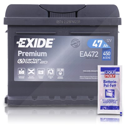 EXIDE - EAN: 3661024034265 - Exide EA472 Premium Carbon Boost 47 Ah 450 A (EA472) - Technische Informationen: Gewicht: 12,13 Kg | Länge: 207 mm | Breite: 175 mm | Höhe: 175 mm] Leistungsdaten: Spannung: 12V | Batteriekapazität: 47 Ah | Kaltstartleistung, EN/A: 450 A].... - bei atp-autoteile.de - aus Yadore Produktdaten Dieses Angebot beinhaltet zusätzlich 10g Pol-Fett, was einen Mehrwert für den Käufer darstellt. ![]() Exide EA472 Premium Carbon Boost 47Ah 450A+10g Pol-Fett [Hersteller-Nr. EA472] für Alfa Romeo, Audi, Austin, BMW, Citro n, Daf, Ford, Hyundai, Jaguar,