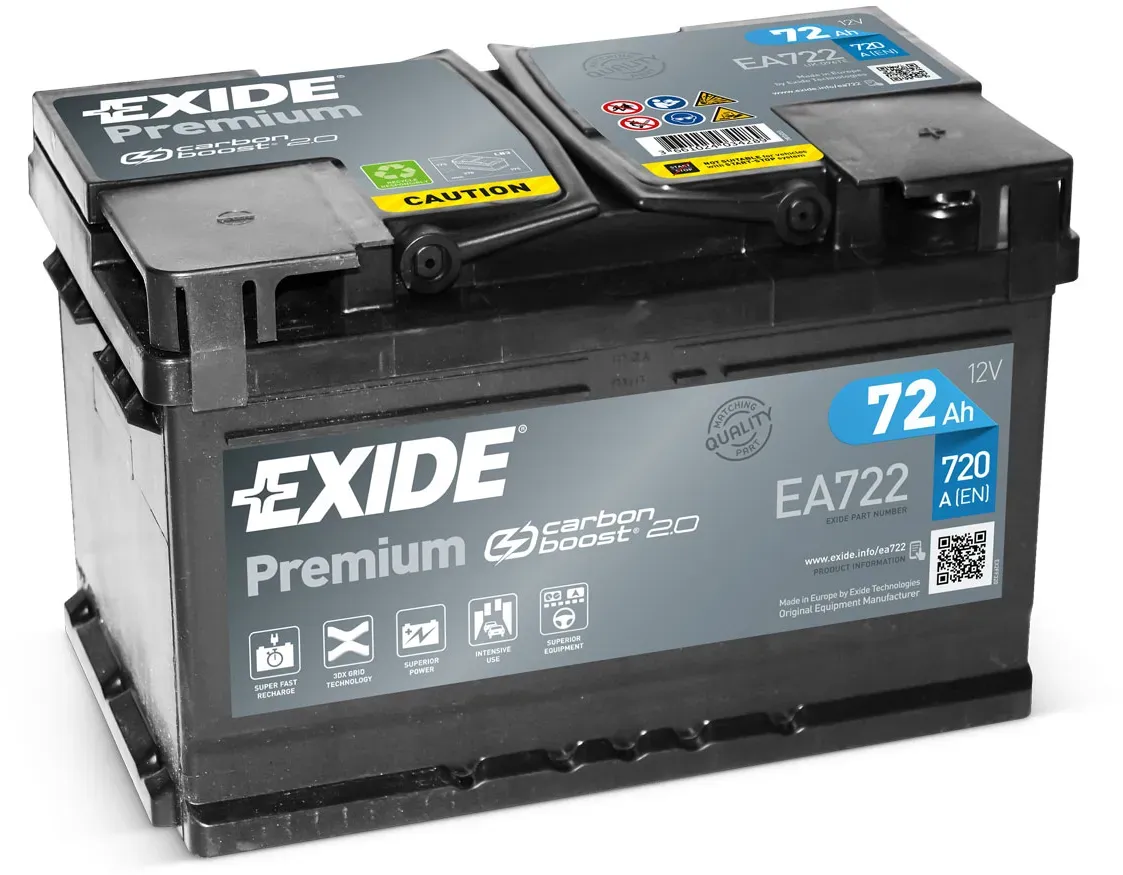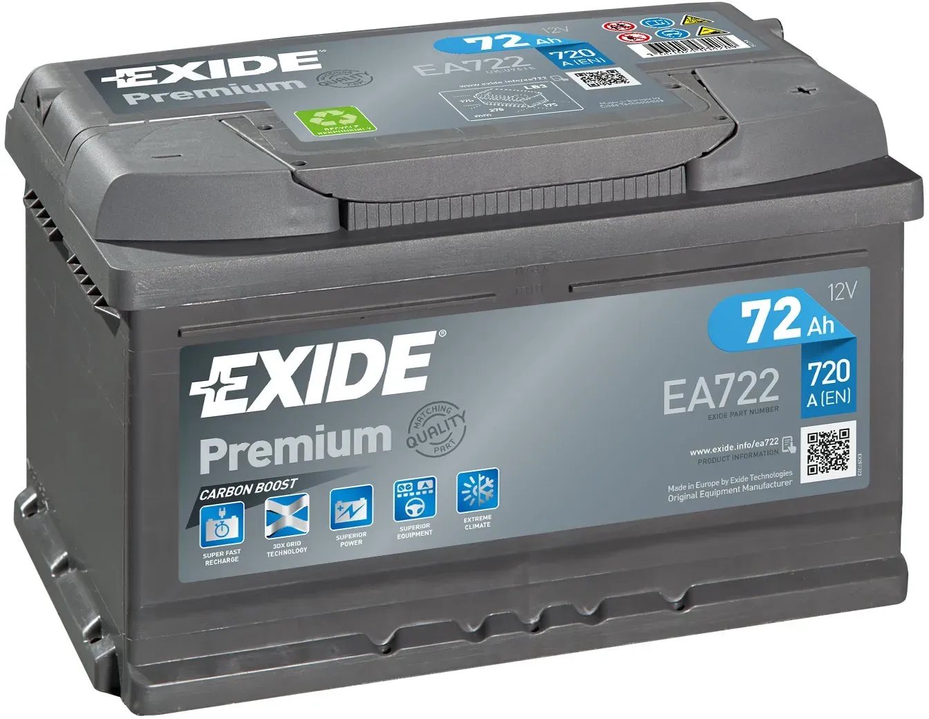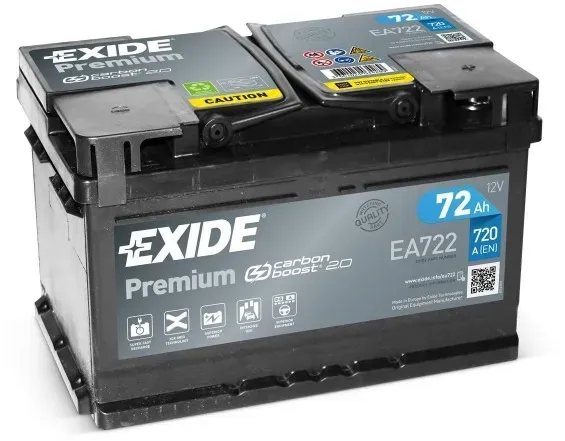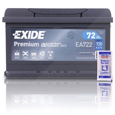 EXIDE - EAN: 4055548380769 - Exide EA722 Premium Carbon Boost 72Ah 720A+10g Pol-Fett (EA722) - Technische Informationen: EXIDE Starterbatterie Gewicht: 17,46 Kg | Länge: 278 mm | Breite: 175 mm | Höhe: 175 mm] Leistungsdaten: Spannung: 12V | Batteriekapazität: 72 Ah |... - bei atp-autoteile.de - aus Yadore Produktdaten ![]() ![]() Exide Premium 12V 72Ah 720A/EN EA722 Autobatterie