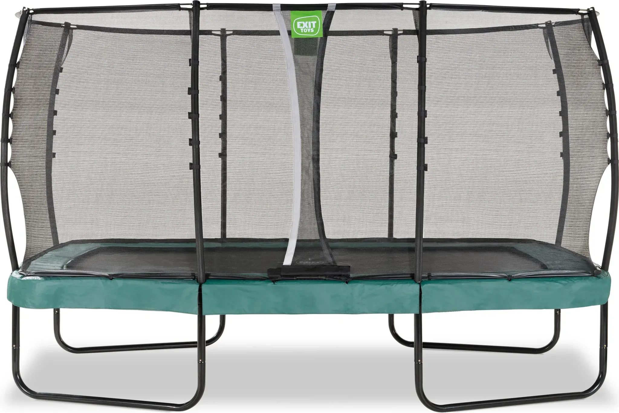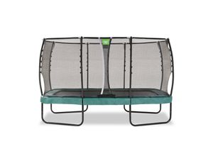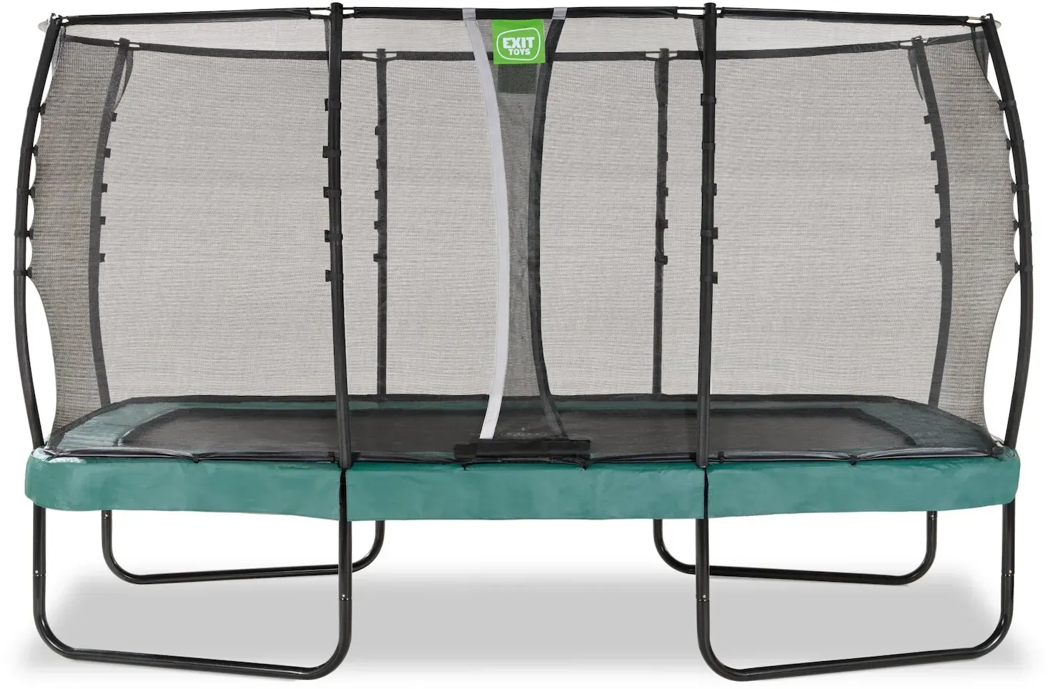 8 Händlerangebote bei billiger.de - Kategorie: Trampoline - EXIT TOYS - Das EXIT Allure Premium Trampolin ist ein Trampolin mit einem Schutzrand und einem Premium Sicherheitsnetz. Dank des EXIT Foot Protection Systems (FPS), einem Netz zwischen dem Sprungtuch und dem Schutzrand des Trampolins, geraten Trampolinspringer nie mit den Füßen zwischen die Sprungfedern. Das mitgelieferte Premium Sicherheitsnetz hat einen überlappenden Eingang, der sich automatisch schließt. Die Rohre des Premium Sicherheitsnetzes sind außerdem mit hochwertigem XPE-Schaumstoff überzogen. Die extra langen, doppelkonische Federn von nicht weniger als 21,6 cm sorgen für den perfekten Sprung und eine weiche Landung. Durch den galvanisierten und pulverbeschichteten Rahmen hat das Trampolin eine lange Lebensdauer. Glasfiberringe und gebogene Rohre halten das Sicherheitsnetz super straff in Form und der extra dicke Schutzrand mit einer wasserabweisenden Pvc-Schicht schützt sowohl dich als auch das Trampolin optimal. - GTIN:8720289694364 ![]() EXIT Allure Premium Bodentrampolin 244x427cm - grün