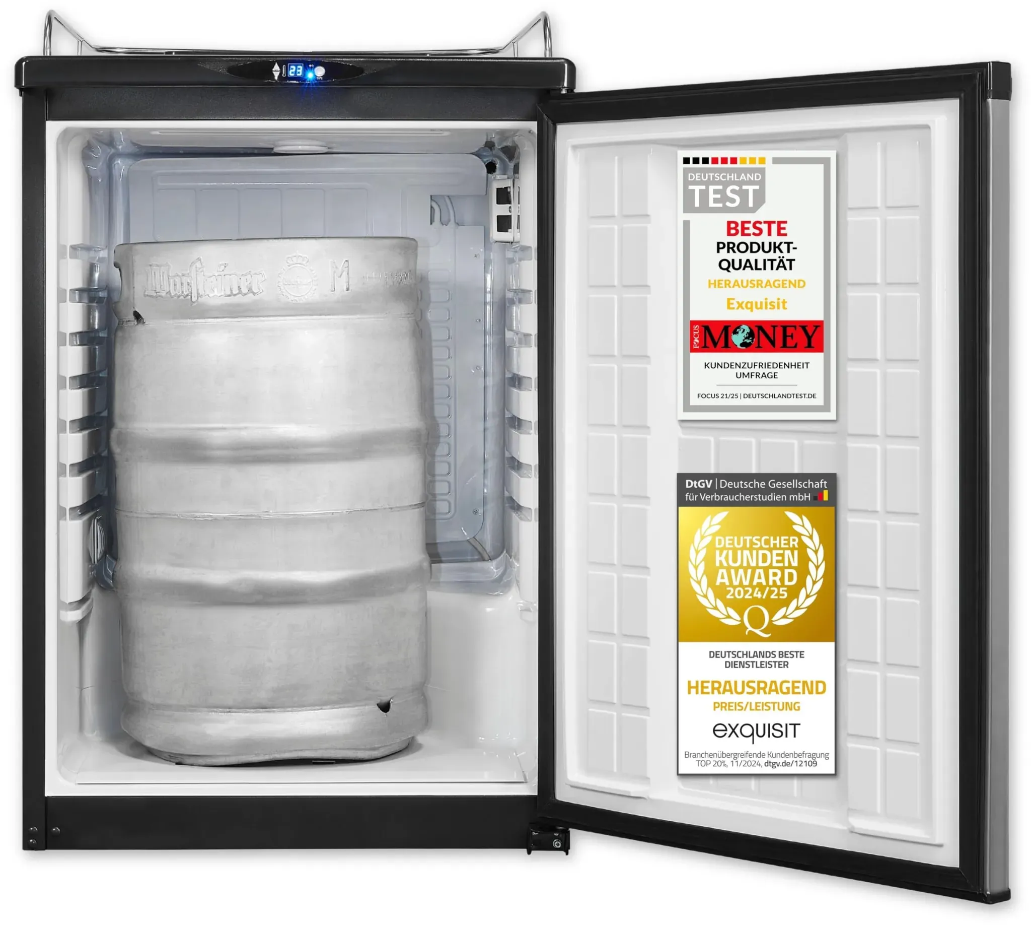 Kategorie: Zapfanlagen - Exquisit - GTIN:4016572407723 - Großer Innenraum für maximale Vielfalt: Mit 163 Litern Volumen bietet der Kühler Platz für Bierfässer von 10 bis 50 Litern perfekt für jede Gelegenheit und jeden Durst. Frisch gezapftes Bier jederzeit genießen: Die integrierte Zapfvorrichtung macht das Ausschenken direkt am Gerät zum Erlebnis ideal für Partys, Terrasse oder Kellerbar. Leise, stark und sparsam im Betrieb: Mit nur 42 dB arbeitet der Bierkühler angenehm geräuscharm ideal für Wohnräume, ohne den Alltag zu stören. Flexible Nutzung mit durchdachten Details: Türanschlag wechselbar, Gitterablage für Flaschen, modernes LED-Display einfach das, worauf es ankommt. Praktisch durchdacht für echten Nutzen: Halterung für CO2-Flasche sorgt für stabile Zapfleistung und freie Innenraumfläche clever gelöst für mehr Komfort beim Kühlen. - 456,99 Euro bei Amazon Marketplace CE - gefunden von billiger.de ![]() ![]() Exquisit Bierkühler, 163 Liter, mit Zapfvorrichtung, Gitterablagen, Türanschlag wechselbar, 89 cm Höhe, 42 dB, Display, BK160-HE-300G inox
