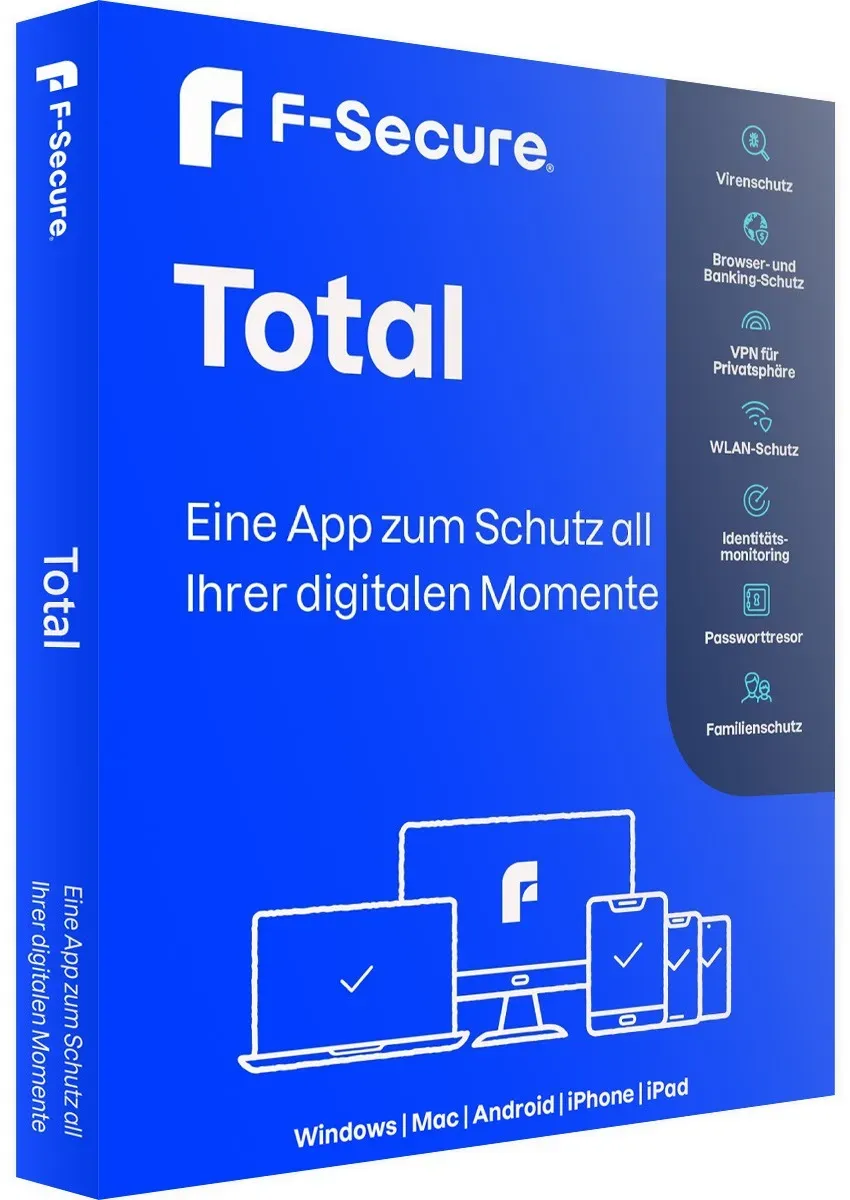 Für eine direkte Suche und Preisvergleich können Sie hier starten: F-Secure Total. Jetzt live Suche nach f-secure total starten! Empfohlene F-secure total Angebote*Durch Käufe über Links zu Händlern kann diese Website eine Provision erhalten, u.a. durch das eBay Partner Network und das AmazonPartnerNetDieses Angebot ist mit 48,49 Euro für 3 Geräte und 1,5 Jahre Laufzeit besonders preiswert und bietet ein gutes Preis-Leistungs-Verhältnis. ![]() ![]() F-SECURE Total Security inkl. VPN 3Geräte 1Jahr +6Mo gratis