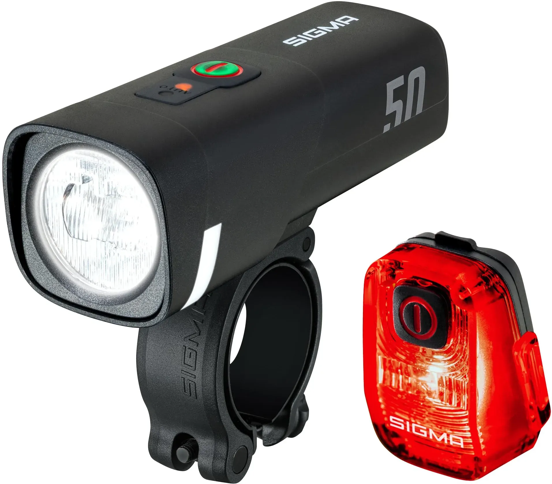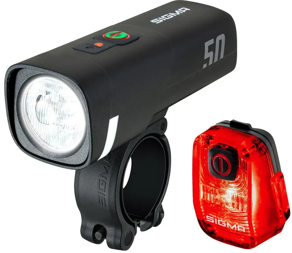 Verfügbarkeit: 2-4 Werktage - Kategorie: Fahrradlampen - Sigma - GTIN:4016224174850 - SIGMA SPORT Leuchten-Set Aura 50 / Hiro 10 (USB-C, StVZO-konform). Inhaltsangabe. Das SIGMA SPORT Aura 50 / Hiro 10 Leuchtenset vereint starke Front- und Rückbeleuchtung in einem formschönen, funktionalen Paket. Die Frontleuchte 'Aura 50' liefert mit bis zu 50 Lux (ca. 160 Lumen) eine Reichweite von bis zu 60 Metern, besitzt einen Helligkeitssensor für automatische Lichtanpassung, zwei Lichtmodi (High/Eco) sowie Memory- und Einschaltschutzfunktion. Die Rückleuchte 'Hiro 10' bietet eine Sichtbarkeit von bis zu 500 Metern und 240° seitliche Sichtbarkeit bei kompakter Bauweise. Beide Lampen sind via USB-C wiederaufladbar, werkzeugfrei zu montieren und erfüllen die deutschen StVZO-Anforderungen. Dieses Set eignet sich ideal für Pendler, Alltagsfahrer und Wochenendtouren.. Features. Dual-Leuchtset: Front- und Rücklicht in einem Paket. USB-C-Aufladung: Schnell und zeitgemäß aufladbar. Brightness Sensor (Auto-Modus): Passt automatische Leuchtstärke an Umgebungslicht an. Zwei Modi (High/Eco): Bis zu 9 h (High) und 28 h (Eco) Leuchtdauer frontseitig. Memory-Funktion: Merkt sich letzte Einstellung. Double-Click-Einschaltschutz: Verhindert ungewolltes Einschalten. SIGMA Light Guide: Erhöhte seitliche Sichtbarkeit vorne. Werkzeugfreie Montage, inkl. Quick-Release Halterungen. IP44-Spritzwasserschutz: Für Alltag und schlechtes Wetter geeignet. Detaillierte Produkteigenschaften. ... Dieses Set bietet ein komplettes Beleuchtungspaket mit Vorder- und Rücklicht, beide StVZO-zugelassen und USB-C wiederaufladbar, ideal für umfassende Sicherheit. ![]() ![]() SIGMA LED Fahrradlicht Set Aura 50/ Hiro 10 | StVZO zugelassenes, akkubetriebenes Vorderlicht und Rücklicht | wetterfestes, wiederaufladbares Beleuchtungsset mit USB-C