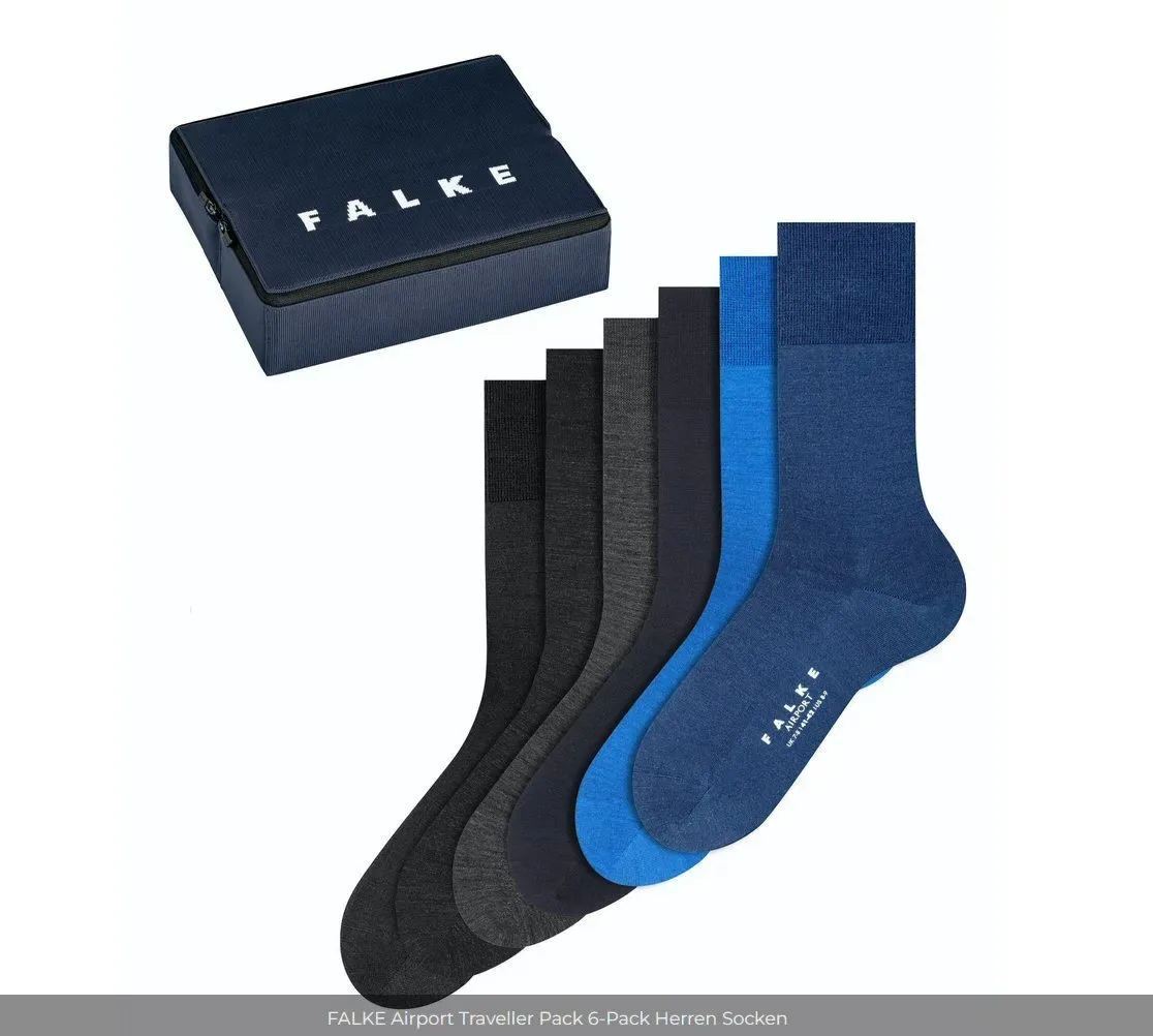 Kategorie: Herrensocken - Falke - GTIN:4004758679675 - Dank der innovativen Kombination von hochwertiger Merinowolle auf der Außenseite und hautsympathischer Baumwolle auf der Innenseite sorgt dieser Strumpf für eine hervorragende Klimaregulation und einen außergewöhnlichen Tragekomfort. Egal ob für Freizeit oder Beruf, dieser Strumpf ist auch aufgrund seiner überaus vielfältigen Farbauswahl immer ein geeigneter Begleiter. Zusätzlich zu der perfekten FALKE-Passform und den verstärkten Belastungszonen, trägt eine besonders flache Spitzennaht zu einem exzellenten Tragegefühl bei. - 24,00 Euro bei Limango Marktplatz - gefunden von billiger.de Dieses 3er-Multipack für 32.28 Euro ist eine kostengünstige Option, um sich mit mehreren Paaren der beliebten Falke Airport Socken einzudecken. ![]() ![]() FALKE Herren Socken Airport Multipack M So Wolle Baumwolle einfarbig 3 Paar, Schwarz Black 3000, 43-44