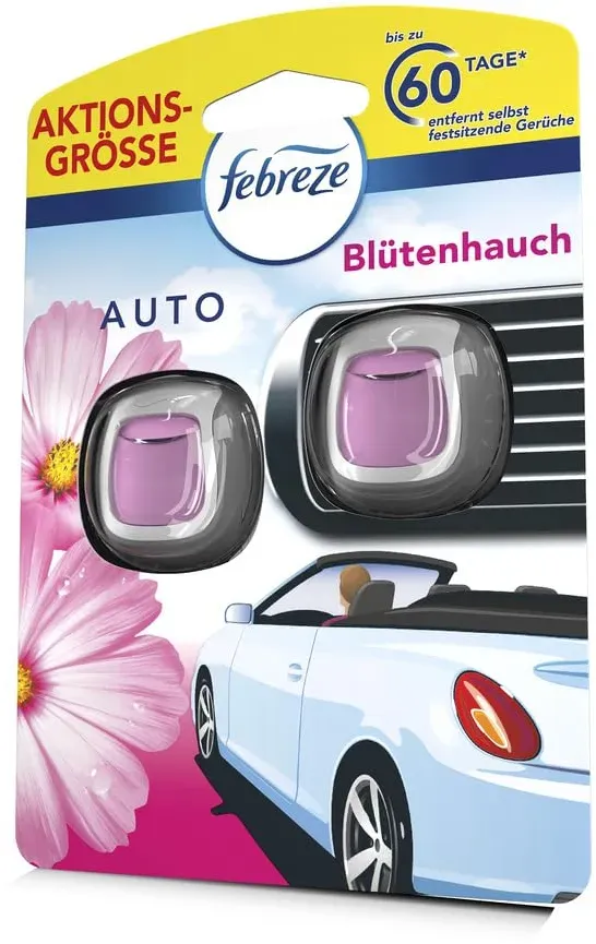 Verfügbarkeit: ca. 1 Woche - Kategorie: Autoreinigung & Pflege - Febreze - GTIN:8700216834070 - 2er-Pack Autoduftspender CAR Blütenhauch 2 ml, Duftrichtung: blumig, Produktverwendung: Geruchsbeseitigung in Fahrzeugen, Lieferumfang: 2x Autoduftspender (2 ml), Reinigung & Hygiene/Raumlufterfrischer/Duftspender - 7,84 Euro bei OTTO Office - gefunden von billiger.de Dieses Duo-Pack Blühtenhauch für 8,09 Euro bietet eine langanhaltende Frische und ist eine beliebte Wahl. ![]() ![]() Febreze Autolufterfrischer Duo-Pack Blütenhauch, 2x2ml, entfernt selbst festsitzende Gerüche