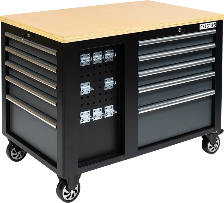 Kategorie: Werkstatteinrichtung - feistos - GTIN:4260280778525 - FEISTOS Hektor | mobile Werkbank | Schwarz | 114x73x89cm Style & Stauraum für die Werkstatt mit FEISTOS! Die mobile Werkbank Hektor ist der perfekte Buddy für deine FEISTOS Werkstatt und punktet mit reichlich Stauraum und hoher Beweglichkeit. 4 Räder und ein massiver Griff sorgen dafür, dass du die Werkbank mit Leichtigkeit umpositionieren kannst. Somit kannst du in unmittelbarer Nähe zu deinem Projekt arbeiten. Dank der vielen Schubladen und Staumöglichkeiten hast du immer alle nötigen Werkzeuge griffbereit und kannst deutlich effizienter arbeiten! Die Highlights im überblick: * Solide Konstruktion: Gehäuse aus pulverbeschichtetem Stahl | 1,0 - 1,2 mm * Moderne Farbgebung: Passt hervorragend zur Apollo oder EOS-Serie! * Großzügiger Stauraum: 6 kleine, 2 mittlere & 2 große Schubladen * Hohe Standortflexibilität dank 4 Rädern aus Kunststoff | Ø 127 mm/Rad * Variable Möglichkeiten: 2 Bockrollen | 2 Lenkrollen mit Feststeller * Stabile Arbeitsplatte aus robustem Multiplex Holz * Integrierter Mülleimer zum schnellen Entsorgen von Abfällen * Vertikales Lagern: Zusätzliche Ordnung durch integrierte Lochwand * Hohe Traglast: 500 kg Zuverlässiges Schubladensystem: * Leichtes Handling: Schubladen mit Vollauszug * Sicherheit im Fokus: Zentralverriegelte Schubladen | inkl. 2 Schlüsseln * Schubladenmaß kleine Schublade: 570x410x83 mm * Schubladenmaß mittlere Schublade: 570x410x112 mm * Schubladenmaß große Schublade: ... ![]() ![]()