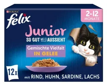 Katzennahrung Haustierzubehör - EAN:7613036894623 - felix R Katzen-Nassfutter So gut wie es aussieht Junior gemischte Vielfalt in Gelee 12x 85,0 g - perfekt für Ihren kleine FellnaseDas felix R Katzen-Nassfutter So gut wie es aussieht Junior gemischte Vielfalt in Gelee 12x 85,0 g bietet deinem heranwachsenden Liebling eine köstliche Vielfalt, die nicht nur schmeckt, sondern auch für ein gesundes Wachstum sorgt.Vielfältige Sorten für kleine FellnasenIhre Katze ist ein kleiner Feinschmecker? Kein Problem! felix R So gut wie es aussieht Junior gemischte Vielfalt in Gelee kommt in einer gemischten Vielfalt, die umfasst. So bleibt jede Mahlzeit abwechslungsreich und dein Liebling wird mit jeder Portion bestens versorgt.Gesunde Ernährung für eine glückliche KatzeMit hochwertigen Zutaten und einer ausgewogenen Rezeptur unterstützt So gut wie es aussieht Junior gemischte Vielfalt in Gelee das Wachstum deines Kätzchens. Die geleeartigen Mahlzeiten sorgen nicht nur für einen hervorragenden Geschmack, sondern auch für die nötige Flüssigkeitszufuhr, die dein Tier benötigt.Gönnen Sie Ihrem Liebling das Beste!Bestellen Sie jetzt und erleben Sie, wie Ihr kleiner Kuschel-Freund vor Freude schnurrt! Verpassen Sie nicht die Chance, Ihrem Kätzchen das felix R Katzen-Nassfutter So gut wie es aussieht Junior gemischte Vielfalt in Gelee 12x 85,0 g zu bieten. - gefunden von Kelkoo Bueroplus. de felix R Katzen-Nassfutter So gut wie es aussieht Junior gemischte Vielfalt in Gelee 12x 85,0 g