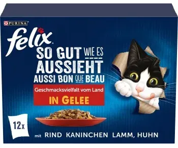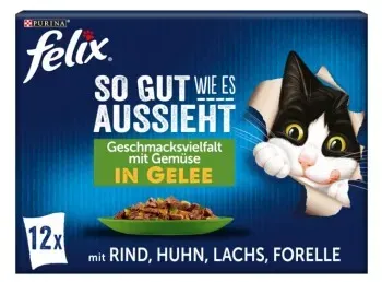 2 Händlerangebote bei billiger.de - Kategorie: Katzenfutter - FELIX - Jede Sorte, hergestellt mit hochwertigen Zutaten, besteht aus zarten Stücken in Gelee für eine leckere Mahlzeit, die Ihre Katze lieben wird! FELIX So gut wie es aussieht ist in einer großen Auswahl leckerer Sorten in saftigem Gelee erhältlich, um Ihrer Katze jeden Tag die Abwechslung zu geben, die sie liebt. Sie schmecken wirklich so gut, wie sie aussehen! FELIX - einfach unwiderstehlich! Alleinfuttermittel für ausgewachsene Katzen Auch für kastrierte oder sterilisierte Katzen geeignet Multipack Katzenfutter in Gelee FELIX Nassfutter mit Vitaminen und Fettsäuren für ein zufriedenes Katzenleben Felix So gut wie es aussieht Geschmacksvielfalt vom Land 12x85g: 3x85g Huhn in Gelee 3x85g Rind in Gelee 3x85g Kaninchen in Gelee 3x85g Lamm in Gelee Felix So gut wie es aussieht Geschmacksvielfalt aus dem Wasser 12x85g: 3x85g Lachs in Gelee 3x85g Scholle in Gelee 3x85g Kabeljau in Gelee 3x85g Thunfisch in Gelee Felix So gut wie es aussieht Geschmacksvielfalt mit Gemüse 12x85g: 3x85g Rind & Karotten in Gelee 3x85g Huhn & Tomaten in Gelee 3x85g Lachs & Zucchini in Gelee 3x85g Forelle & grüne Bohnen in Gelee Alleinfuttermittel für ausgewachsene Katzen, weitere Informationen erhalten Sie hier: 069/6671-3088 oder auf www.purina.de - GTIN:7613036893848 ![]() ![]() FELIX So gut wie es aussieht Geschmacksvielfalt vom Land in Gelee 12 x 85 g