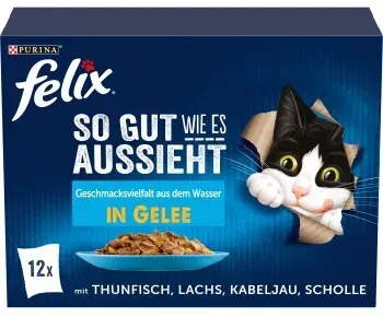 1 Händlerangebote bei billiger.de - Kategorie: Katzenfutter - FELIX - Jede Sorte, hergestellt mit hochwertigen Zutaten, besteht aus zarten Stücken in Gelee für eine leckere Mahlzeit, die Ihre Katze lieben wird! FELIX So gut wie es aussieht ist in einer großen Auswahl leckerer Sorten in saftigem Gelee erhältlich, um Ihrer Katze jeden Tag die Abwechslung zu geben, die sie liebt. Sie schmecken wirklich so gut, wie sie aussehen! FELIX - einfach unwiderstehlich! Alleinfuttermittel für ausgewachsene Katzen Auch für kastrierte oder sterilisierte Katzen geeignet Multipack Katzenfutter in Gelee FELIX Nassfutter mit Vitaminen und Fettsäuren für ein zufriedenes Katzenleben Felix So gut wie es aussieht Geschmacksvielfalt vom Land 12x85g: 3x85g Huhn in Gelee 3x85g Rind in Gelee 3x85g Kaninchen in Gelee 3x85g Lamm in Gelee Felix So gut wie es aussieht Geschmacksvielfalt aus dem Wasser 12x85g: 3x85g Lachs in Gelee 3x85g Scholle in Gelee 3x85g Kabeljau in Gelee 3x85g Thunfisch in Gelee Felix So gut wie es aussieht Geschmacksvielfalt mit Gemüse 12x85g: 3x85g Rind & Karotten in Gelee 3x85g Huhn & Tomaten in Gelee 3x85g Lachs & Zucchini in Gelee 3x85g Forelle & grüne Bohnen in Gelee Alleinfuttermittel für ausgewachsene Katzen, weitere Informationen erhalten Sie hier: 069/6671-3088 oder auf www.purina.de - GTIN:7613036894562 ![]() ![]() FELIX So gut wie es aussieht Geschmacksvielfalt aus dem Wasser 12 x 85 g
