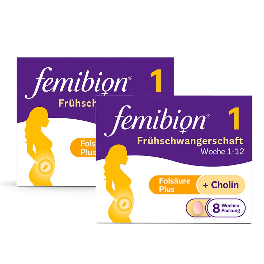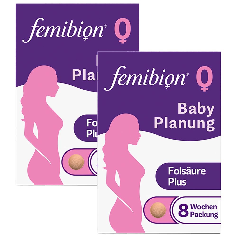 0.69 eur / 1 ct - Vitamine, Mineralien & Nahrungsergänzungsmittel Vitamine & Ergänzungen - EAN:4054839695834 - Nahrungsergänzungsmittel sind kein Ersatz für eine ausgewogene, abwechslungsreiche Ernährung und eine gesunde Lebensweise.Femibion R Kinderwunsch und Frühschwangerschaft ohne JodFEMIBION R 1 KINDERWUNSCH + FRÜHSCHWANGERSCHAFT Schwangerschaftsvitamine ohne Jod mit Folsäure Plus und weiteren ausgewählten Nährstoffen - speziell entwickelt für die gesunde Entwicklung deines Babys ab Kinderwunsch bis zur 12. Schwangerschaftswoche. Femibion R 1 Kinderwunsch + Frühschwangerschaft ohne Jod unterstützt deinen Körper ab Kinderwunsch und in der ersten Zeit der Schwangerschaft, indem es hilft, dich und dein Baby mit ausreichend Folsäure bzw. Folat zu versorgen. Die ausreichende Versorgung mit Folsäure hilft, das Risiko für die Entstehung von Neuralrohrdefekten (d.h. Fehlbildungen des zentralen Nervensystems) beim heranwachsenden Baby zu senken.*Femibion R enthält Folsäure Plus, eine speziell entwickelte Kombination aus Folsäure und der Premium-Folatform Metafolin R , welche direkt von deinem Körper verwertet werden kann.Folsäure Plus mit 800 ?g Folat-Booster incl. Metafolin R hilft dir rechtzeitig den optimalen Folat-Spiegel zu erreichen und so von Anfang an die gesunde Entwicklung deines Babys zu unterstützen.*Ergänzt um weitere ausgewählte Nährstoffe wie z.B. Vitamin D für das Immunsystem, ist Femibion R 1 dein zuverlässiger Begleiter ab Kinderwunsch und in den ersten drei ... Ein Doppelpack für die Babyplanung, der eine längere Versorgung sicherstellt und oft günstiger ist als Einzelpackungen. ![]() 2x Femibion 0 Babyplanung Tabletten 2x56 St