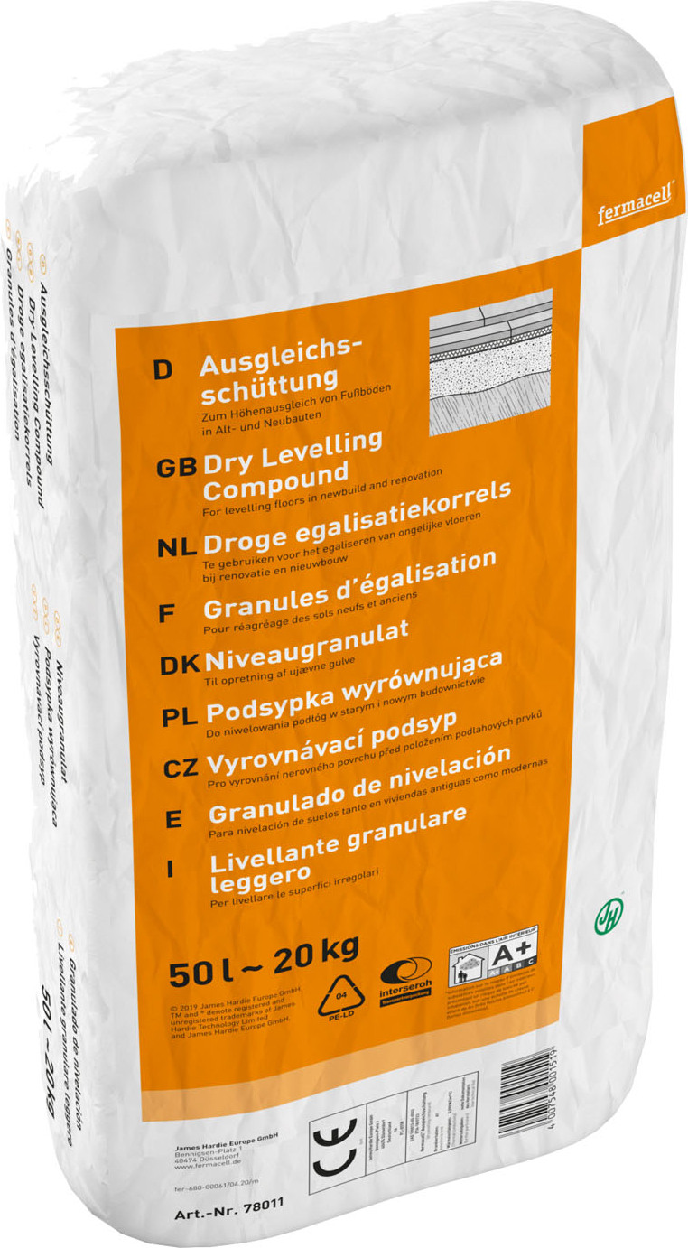 EAN: 4007548001519 - fermacell FC-Ausgleichsschüttung Körnung 0-4mm 50lAnwendungDie fermacell Ausgleichsschüttung ist ideal zum Niveauausgleich bei unebenen Fußböden in Alt- und Neubauten. Auf wirtschaftliche Weise lassen sich effektive Konstruktionen zum Schall-, Brand- und Wärmeschutz erstellen. Die Ausgleichsschüttung eignet sich hervorragend für den Einsatz unter fermacell Estrich-Elementen. Bei Schütthöhen 100 mm und in Feuchtebereichen empfehlen wir fermacell Gebundene Schüttung. EigenschaftenZeitersparnis, da keine aufwendige mechanische VerdichtungKostenreduzierung, da keine zusätzliche Abdecklage erforderlichErstklassiger Brandschutz, da nichtbrennbar, Baustoffklasse A1Ungeziefer- & NagetiersicherGeprüftes und langjährig bewährtes SystemSchütthöhe bis 100 mm in Wohngebäuden (Anwendungsbereich 1)Geringes Gewicht ermöglicht Einsatz auch auf LeichtdeckenAuch als Dämmschüttung auf Holzbalkendecken einsetzbarRohstoffschonendes Recyclingprodukt - bei kaufland.de - aus Yadore Produktdaten ![]() ![]() fermacell Gebundene Schüttung T Ausgleichsschüttung