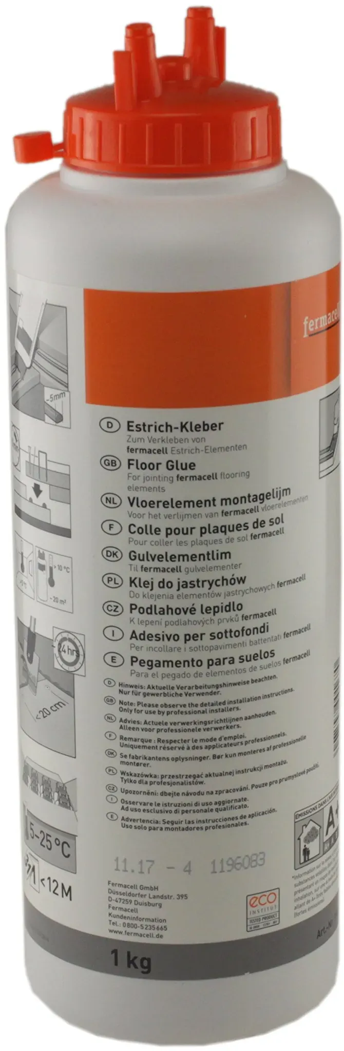Baustoffe und Installationsmaterial Bauchemie sonstige Baukleber Baumaterialien - EAN:4007548001670 - Der Estrich-Kleber von fermacell ist ideal für das Verkleben von fermacell Gipsfaser- bzw. PowerpanelTE Estrich-Elementen geeignet. Die spezielle Doppeldüse sorgt für die richtige Klebemenge und die richtige Platzierung des Klebstoffs auf dem Falz Einsatzgebiete: zur Stufenfalz-Verklebung von allen fermacell Gipsfaser- bzw. Powerpanel TE Estrich-Elementen zur Verklebung einer zusätzlichen 3. Lage fermacell Gipsfaserplatten zur Vor-Ort-Verlegung von fermacell Trockenestrich Eigenschaften: schadstoff- und emissionsarm, geprüft vom eco-Institut Köln einfache Verarbeitbarkeit ca. 40-50 g/m², entspricht ca. 20 - 25 m² je Flasche Inhalt: 1 kg - gefunden von Kelkoo Dieser Estrichkleber ist eine bewährte Wahl für Fermacell Bodensysteme und wird von mehreren Händlern angeboten. ![]() ![]() Fermacell Estrichkleber 1 kg, Polyurethan, Paste, Bodenkleber, für fermacell Bodensysteme, Braun