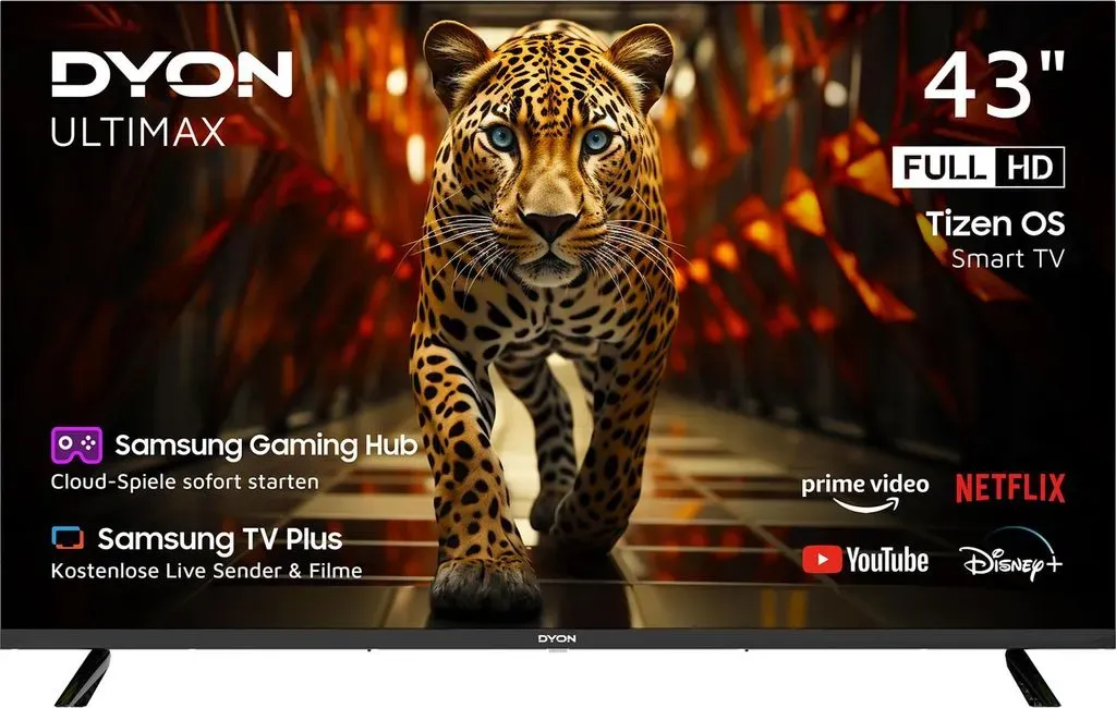 6 Händlerangebote bei billiger.de - EEK: E - Kategorie: Fernseher - DYON - Smart LED-Fernseher mit Samsung Tizen OS - 43 Zoll (108 cm) Bildschirmdiagonale mit einer Full-HD Auflösung (1920 x 1080 Pixel) und einer Bildwiederholrate von 50/60 Hz. 1080p Full-HD: Gestochen scharfe Bilder und intensive Farben lassen jedes Detail lebendig werden. Fernseherlebnis der Extraklasse: Erlebe mit TIZEN atemberaubende Multimediafunktionen, blitzschnelle Ladezeiten sowie eine intuitive Navigation und mache dein Fernseherlebnis noch smarter und unterhaltsamer. Grenzenlose Welten: Samsung TV Plus bietet Dir eine Vielzahl von Live-Kanälen, On-Demand-Inhalten, spannende Serien oder fesselnde Filme - komplett ohne Abonnement. Smart Hub: Mit dem Samsung Smart Hub hast du schnellen & einfachen Zugriff auf Apps, Filme, Musik und vieles mehr. Gaming Hub: Verbinde deinen Bluetooth- oder USB-Controller und tauche ein in aufregende Gaming-Abenteuer ohne diese extra runterzuladen. StreamView: Verbinde dein Smartphone völlig unkompliziert mit deinem Fernseher und genieße ganz einfach und flexibel deine Lieblingsinhalte. - GTIN:4260552544339 Der DYON Smart 43 VX ist mit 189,99 Euro ein preiswertes Full-HD Smart TV mit vielen Streaming-Apps. ![]() ![]() DYON Smart 43 VX - 43 Zoll (108 cm) Full-HD Smart TV mit HD Triple Tuner (DVB-C/-S2/-T2), App Store, Prime Video, Netflix, YouTube, DAZN, Disney+, waipu.TV, Hotelmodus