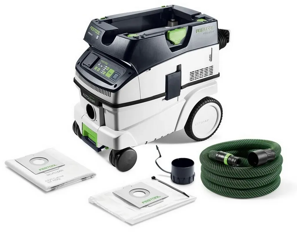 Verfügbarkeit: Sofort versandfertig, Lieferzeit 1 bis 2 Arbeitstage - Kategorie: Nass-/Trockensauger - Festool - GTIN:4014549430637 - Beschreibung:Freier Filter. Dank automatischer Abreinigung AUTOCLEAN. Der CLEANTEC CTM 26 EI AC punktet mit einer im Vergleich zum Vorgänger effektiveren AUTOCLEAN Hauptfilterabreinigung. Das sorgt für konstant hohe Saugleistung, längere Arbeitsintervalle und eine längere Filterlebensdauer bei geringerem Wartungsaufwand. Mit Touch-Bedienung zur intuitiven Steuerung deines Saugers. Mit fest installierter Bluetooth® Schnittstelle, um den Sauger per Festool Akku-Werkzeug oder optionaler Fernbedienung automatisch zu starten. Vernetzt ist dein Sauger auch mit der Festool App, hier lassen sich z.B. Abreinigungsintervalle einstellen. Der glatte, antistatische Saugschlauch kann praktisch im integrierten Schlauchdepot verstaut werden. AUTOCLEAN: Effektivere, automatische Hauptfilterabreinigung für konstant hohe Saugleistung. Abreinigungsintervalle (15, 30, 60 oder 120 Sekunden) per App einstellbar. Vollabreinigung bei stark zugesetztem Filter Intuitiv: Touch-Bedienung für einfache Steuerung des Saugers Automatik-Steckdose: Für kabelgebundene Elektrowerkzeuge. Startet das Elektrowerkzeug, startet automatisch auch dein Sauger Saugleistung: Kann je nach Anwendung in 5 Stufen eingestellt werden Smart: Durch die integrierte Bluetooth® Technologie startet der Sauger über Bluetooth® Akkupacks oder optionale Fernbedienung automatisch Komfortabel: ... Dieses Angebot ist besonders attraktiv, da es das Absaugmobil mit einer praktischen Bluetooth-Fernbedienung kombiniert. ![]() ![]() Festool Absaugmobil CLEANTEC CTM 26 EI AC + Fernbedienung CT-F mit Bluetooth
