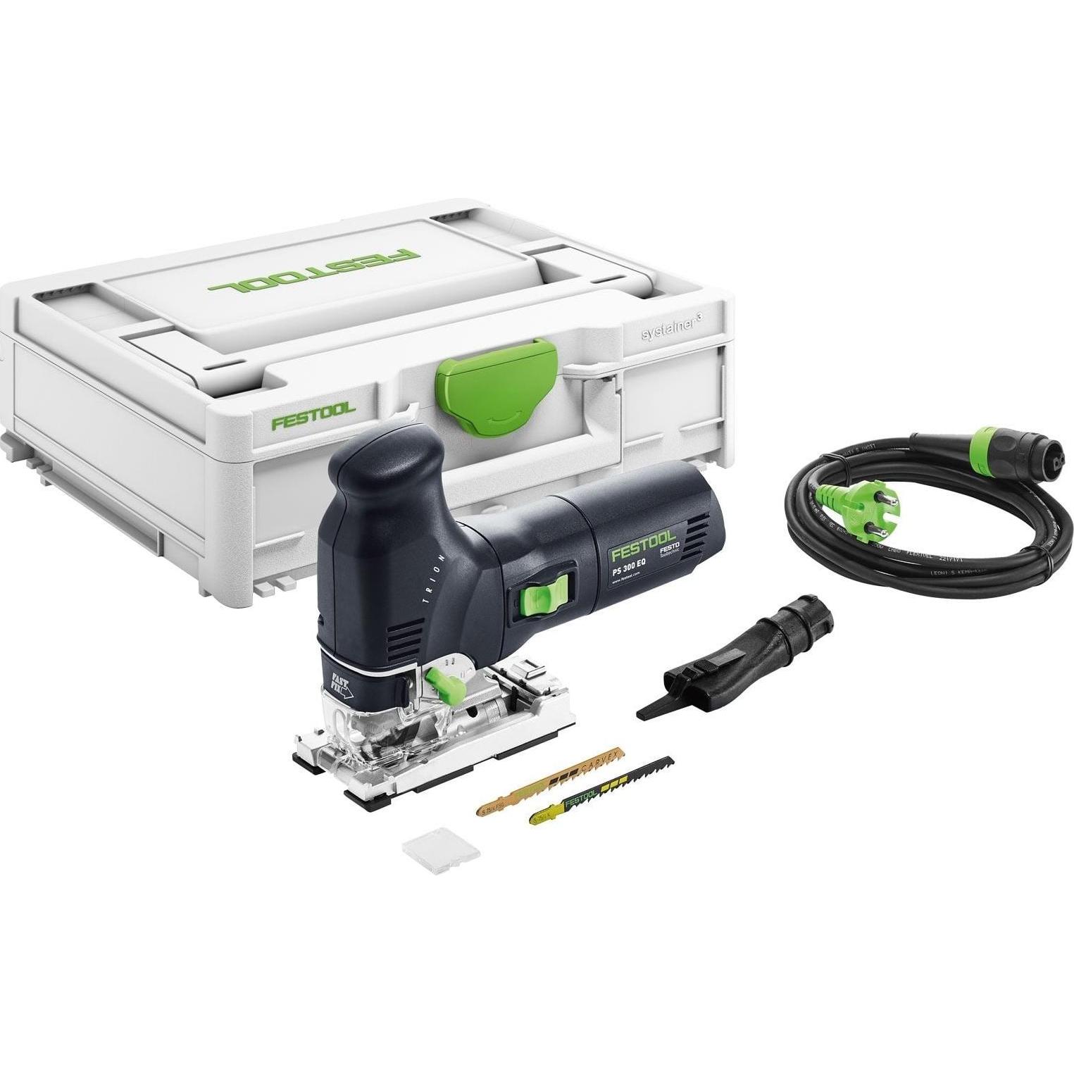 Zustand: Neu - Stichsägen Elektro-Stichsägen - Festool - 576047 - EAN: 4014549357118 - Ermüdungsarme Einhandbedienung durch günstigen Schwerpunkt FastFix Schnellwechselsystem für einfachen Sägeblattwechsel Ausschnitte für Spülen und Kochmulden Technische Merkmale: Antriebsart Netz; Leistungsaufnahme 720 W; Hubzahl 1000 - 2900 min»¹; Pendelhubverstellung in Stufen 4; Schrägstellung 0 - 45 °; Schnitttiefe Holz 120.00 mm; Schnitttiefe NE-Metall 20.00 mm; Schnitttiefe Stahl (weich) 10.00 mm; Kabellänge 4.00 m; Produktgewicht 2.40 kg; Standard 230V; Inhalt: 1 Stück Lieferumfang: Festool Pendelstichsäge PSB 300 EQ-Plus TRION, x Stichsägeblatt-Set: 1x WOOD FINE CUT S 75/2,5 und 1x WOOD UNIVERSAL S 75/4 FSG, Splitterschutz, Systainer SYS3 M 137 - Verkäufer: RUBART GmbH im amazon.de Marketplace Dieses Angebot beinhaltet die Stichsäge mit einem STS-Sort und Systainer, was eine praktische Komplettlösung darstellt. ![]() ![]() Festool PS 300 EQ-Plus Trion inkl. STS-Sort + Systainer SYS 3 M 137