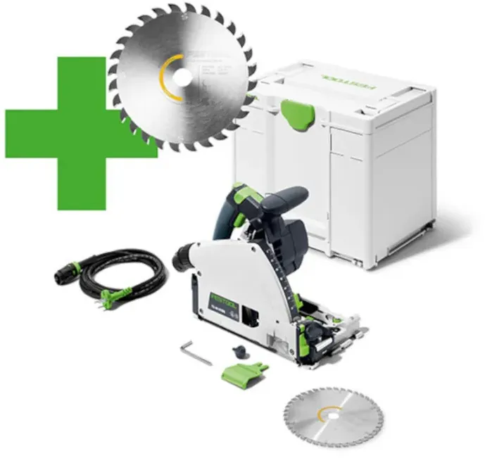 Kategorie: Handkreissägen - Festool - GTIN:4014549373620 - Lieferumfang TauchsägeInnensechskantschlüssel SW 5Kreissägeblatt WOOD FINE CUT HW 168x1,8x20 WD42SichtfensterSplitterschutzSystainer SYS3 M 337 Beschreibung Welten weiter. Der Maßstab im Sägen.Festool Tauchsägen setzen seit Jahrzehnten den Maßstab im Sägen. Die TS 60 K definiert diesen noch einmal neu. Schnell wie ein Wimpernschlag schützt der einzigartige KickbackStop euer Werkstück und minimiert die Gefahr von Verletzungen. Perfekt abgestimmt auf das gesamte Festool Sägesystem und mit 60 mm Schnitttiefe könnt ihr euch mit der vielseitigsten Säge ihrer Art auf erstklassige Arbeitsergebnisse verlassen. Natürlich auch bei Gehrungsschnitten und massiven Platten. Unübertroffen ist die Möglichkeit, die TS 60 K jetzt mit der Kappschiene zu kombinieren. So entsteht mit wenigen Handgriffen ein einfach zu nutzendes Kapp-Sägesystem für präzise und winkelgenaue Schnitte. Mit dem bürstenlosen EC... - 681,87 Euro bei Maschinenhandel Meyer - gefunden von billiger.de Dieses Angebot beinhaltet die Säge mit wichtigem Zubehör im Systainer, was für viele Anwender eine praktische Komplettlösung darstellt. ![]() ![]() Festool Tauchsäge TS 60 KEBQ-Plus (mit Kreissägeblatt, Sichtfenster, Splitterschutz, Innensechskantschlüssel), im Systainer