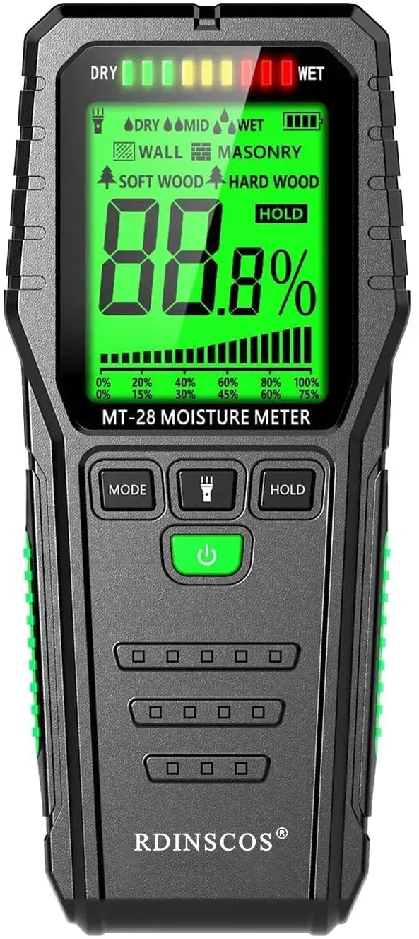 Zustand: Gebraucht - Feuchtigkeitsmessgeräte - RDINSCOS SHENZHEN REDDRAGON INSTRUMENTS CO.,LTD - MT28 MT19B - EAN: 0730229248906 - Das RDINSCOS feuchtigkeitsmessgerät erkennt relative feuchtigkeitsniveaus, die durch Lecks und Überschwemmungen verursacht werden, und misst den Feuchtigkeitsgehalt in Ihren Baumaterialien. Das MT28 feuchtemessgerät mauerwerk nutzt ein elektromagnetisches Feld, um in eine Tiefe von ‰¤20 mm einzudringen. Das Feuchtigkeitsmessgerät verfügt über eine praktische 'Hold'-Funktion, die das Messen an schwer zugänglichen Stellen ermöglicht. Drücken und halten Sie die Kalibrierungstaste mindestens 5 Sekunden lang. Auto ausschalten nach 30 Minuten und 9V-Batterie enthalten. Bitte halten Sie beim Messen einen sicheren Abstand zu metallischen Objekten. Die Hold-Funktion friert die Daten ein, verfügt über ein dreifarbige Anzeige und beinhaltet einen akustischen Alarm. - 1 Händler im amazon.de Marketplace ![]() ![]() RDINSCOS Feuchtigkeitsmessgerät für Wände Zerstörungsfrei & Wiederaufladbarkeit Feuchtigkeitsmesser Wand mit Farb-LCD für Mauerwerk, Boden, Decke, Wohnmobil