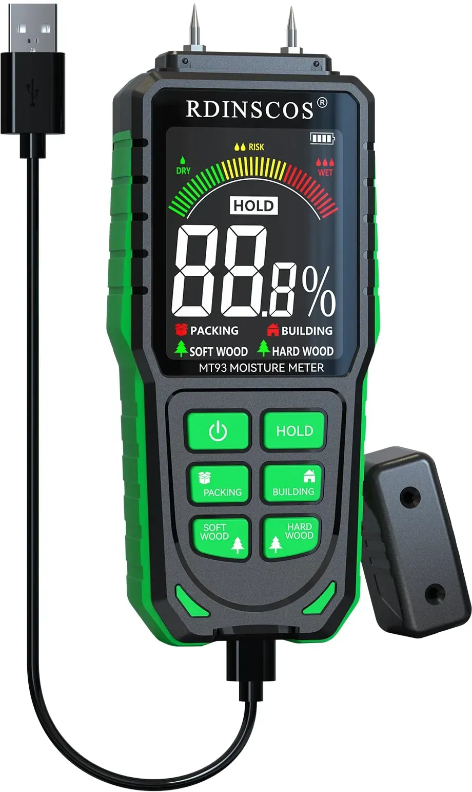 Kategorie: Feuchtigkeitsmessgeräte - rdinscos - Schnelle und genaue Messung: Stecken Sie zwei hochpräzise Stifte in die Testfläche, und das MT19 Holzfeuchtemessgerät gibt schnell den Feuchtigkeitswert an. Es ist die beste Wahl. Entdecken Sie versteckte Probleme: Das perfekte Werkzeug, um den Feuchtigkeitsgehalt Ihres Brennholzes zu prüfen und sicherzustellen, dass Ihr Holz brennbar ist. Benutzerfreundlich: Unser Feuchtigkeitsmessgerät verfügt über ein großes und leicht ablesbares LED-Display mit Hintergrundbeleuchtung. Die HOLD-Taste friert den Bildschirm ein, und die Taschenlampenfunktion ermöglicht den Einsatz an dunklen Orten. Breite Anwendung: Dieses Gerät erkennt die Feuchtigkeit in verschiedenen Hölzern, Baumaterialien, Papier, Wänden und Böden. Die mitgelieferten Ersatzstifte sorgen für eine längere Lebensdauer. Tipps 1: Für beste Ergebnisse des Holzfeuchtigkeitsgehalts schieben Sie die Stifte tief in das Material, stellen Sie sicher, dass die Stifte mit dem Material (Wand, Holz oder Hartholz) in Kontakt sind, und versuchen Sie, nicht zu schütteln. Tipp 2: Wenn der Messwert 0 ist, bedeutet dies, dass das Holz extrem trocken ist, als Isolator wirkt und keinen Strom leitet. - 18,69 Euro bei Amazon Marketplace Home Improvement - gefunden von billiger.de ![]() ![]() rdinscos Feuchtigkeitsmessgerät Wiederaufladbar Holzfeuchtemessgerät Feuchtigkeitsmesser Detector Pin-Typ Feuchtigkeitsdetektor mit 4 Modi Feuchtemessgerät für Holz,Brennholz,Wände,Baustoffen