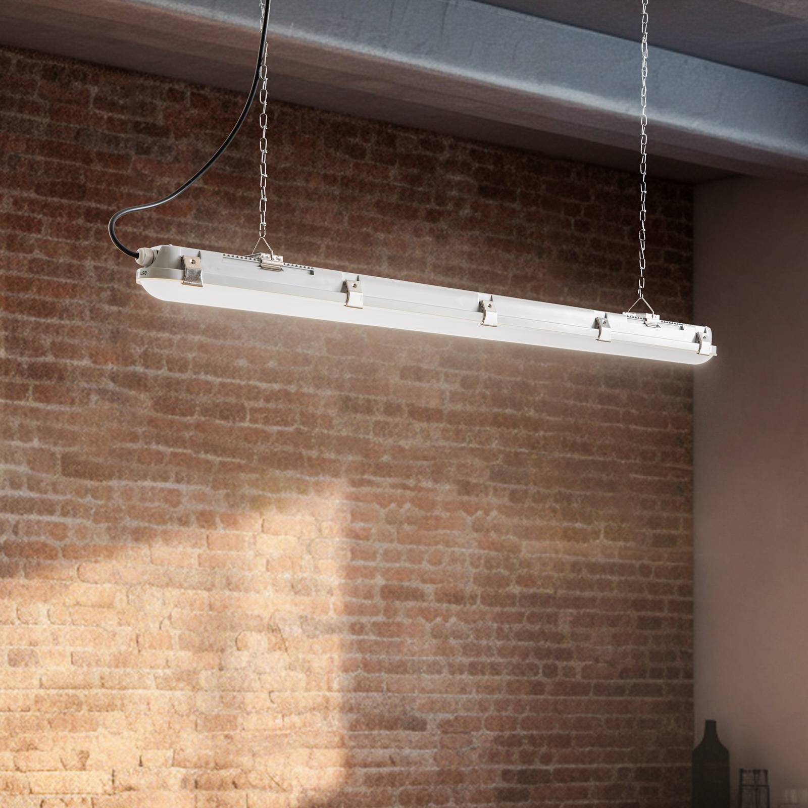 Kategorie: Deckenleuchten - Hoftronic - GTIN:8720722706371 - LED mit Mehrfach-Schutz (Wasserdicht): Unsere 150 cm lange LED-Wannenleuchte ist wasserdicht, staubdicht, stoßfest und resistent gegen chemische Dämpfe. Sie funktioniert bei Temperaturen von -20° bis +40° C und deshalb in fast allen Bereichen, zum Beispiel in Kellern, Kühlräumen, Küchen, Garagen, Schuppen und Lagerhallen. Diese LED Langfeldleuchte hat eine sehr geringe Einbauhöhe von nur 5,8 cm und eignet sich daher auch hervorragend als Unterbauleuchte. 50% Energie und Kosten sparen: Unsere LED Feuchtraumleuchte erzeugt eine Lichtleistung von starken 5760 Lumen, benötigt dafür aber nur 48 Watt. Im Vergleich zu einer 82 Watt Leuchtstofflampe mit ähnlichen Lichtwerten sparst du mit dieser LED-Lampe bis zu 50% Energiekosten. Plug and Play: Das Anbringen dieser LED Feuchtraumwannenleuchte ist kinderleicht, denn die Lichtquelle ist integriert. Du musst also nicht extra LED-Röhren kaufen. Außerdem erhältst du die Leuchte im Komplettset mit allem, was du zur Montage benötigst und kannst mithilfe der Anschlussverschraubungen bis zu 8 Leuchten miteinander verbinden. Vielseitig verwendbar: Die LED-Wannenleuchte kannst du in sehr vielen Bereichen einsetzen. Sie ist stabil und gegen Vandalismus geschützt (Schutzklasse IK07). Damit eignet sich die LED Lichtleiste zum Beispiel auch für öffentliche Bereiche - innen und außen. Wir können sie auch für die Verwendung in Parkhäusern empfehlen, weil ihr diffuses Licht nicht ... Diese Trilux Feuchtraum-Wannenleuchte bietet eine sehr hohe Lichtleistung und ist eine Premium-Option für maximale Beleuchtungsanforderungen. ![]() ![]() Trilux, Wandleuchte + Deckenleuchte, Feuchtraum-Wannenleuchte (6200 lm)