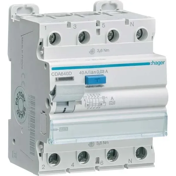 13 Händlerangebote bei billiger.de - Kategorie: Sonstige Elektroinstallationsartikel - Hager - Fehlerstromschutzschalter 4 polig 10kA 40A 30mA Typ A. Fehlerstrom-Schutzschalter (FI) nach DIN EN 61008-1 (VDE 0664-10), DIN EN 61008-2-1 (VDE 0664-11) mit Bi-Connect-Klemmen unten, externe blaue Test-Taste und Fehlerstromanzeige. Geeignet zum nachträglichen Anbau von Zusatzeinrichtungen. Anschlussklemmen mit Draht-Einschiebe-Schutz, Beschriftungsmöglichkeit direkt am Gerät. - GTIN:3250611620648 Dieses Angebot von Reichelt.de für 49.95 Euro ist ein gutes Preis-Leistungs-Verhältnis für den Hager CDA440D. Reichelt.d e HAGER CDA440D - FI-Schutzschalter 4 polig 6kA 40A 30mA Typ A