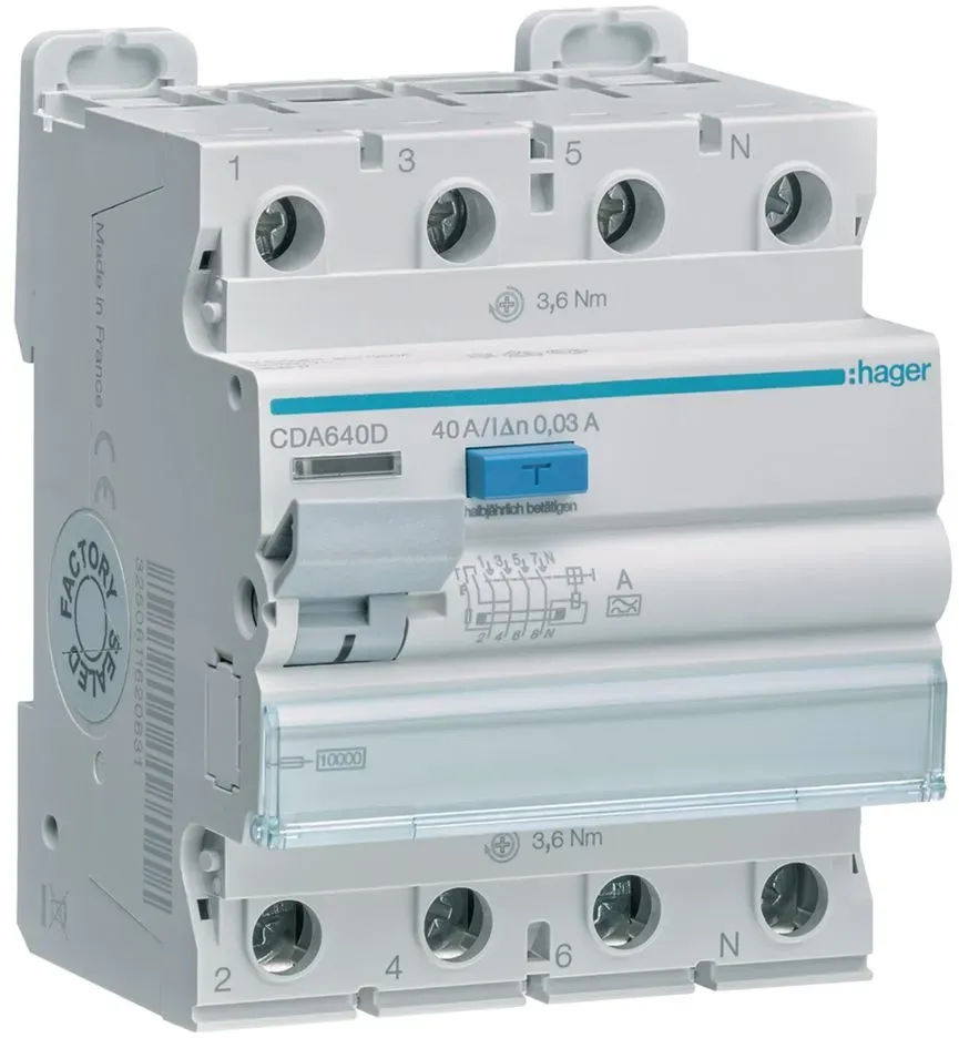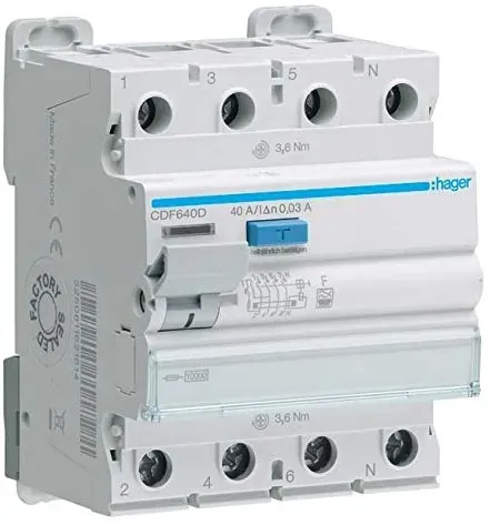 14 Händlerangebote bei billiger.de - Kategorie: Sonstige Elektroinstallationsartikel - Hager - Fehlerstromschutzschalter 4 polig 10kA 40A 30mA Typ F. Fehlerstrom-Schutzschalter (FI) nach DIN EN 61008-1 (VDE 0664-10), DIN EN 61008-2-1 (VDE 0664-11) mit Bi-Connect-Klemmen unten, externe blaue Test-Taste und Fehlerstromanzeige. Geeignet zum nachträglichen Anbau von Zusatzeinrichtungen. Anschlussklemmen mit Draht-Einschiebe-Schutz, Beschriftungsmöglichkeit direkt am Gerät. - GTIN:3250611621614 Dieser Hager CDH640D für 182.05 Euro ist ein Typ A FI-Schutzschalter mit erhöhter Stoßstromfestigkeit (HI), ideal für Bereiche mit Blitzschlaggefahr. ![]() ![]() Hager CDH640D