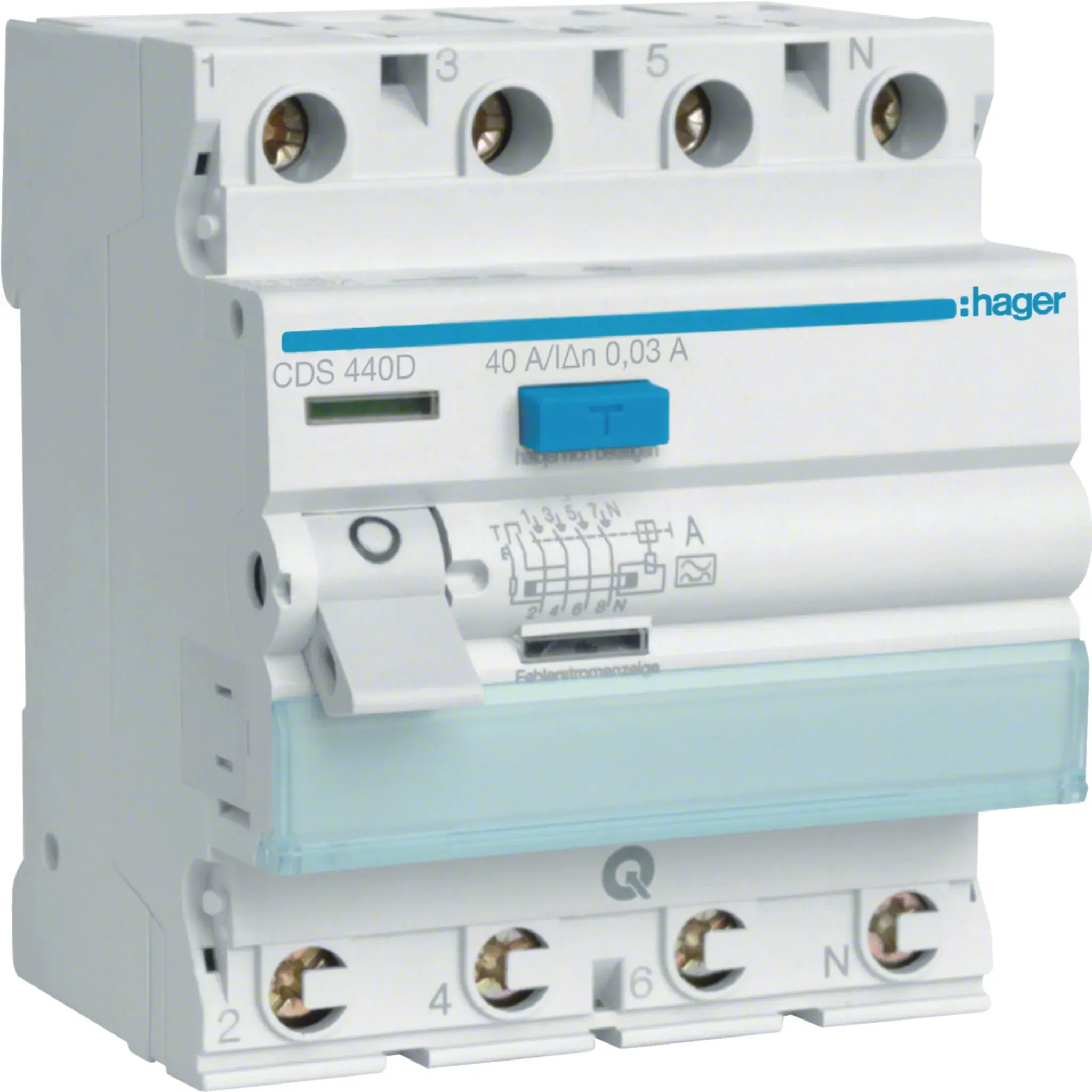 19 Händlerangebote bei billiger.de - Kategorie: Sonstige Elektroinstallationsartikel - Hager - Fehlerstromschutzschalter 4 polig 6kA 40A 30mA Typ A.Fehlerstrom-Schutzschalter (FI) nach DIN EN 61008-1 (VDE 0664-10), DIN EN 61008-2-1 (VDE 0664-11) mit Bi-Connect-Klemmen unten, externe blaue Test-Taste und Fehlerstromanzeige. Geeignet zum nachträglichen Anbau von Zusatzeinrichtungen. Anschlussklemmen mit Draht-Einschiebe-Schutz, Beschriftungsmöglichkeit direkt am Gerät. - GTIN:3250611610076 Dieser FI-Schutzschalter CDS440D ist mit 36.96 Euro eine gute Option für den Standard-Typ A mit QuickConnect. ![]() ![]() Hager FI-Schutzschalter CDS440D