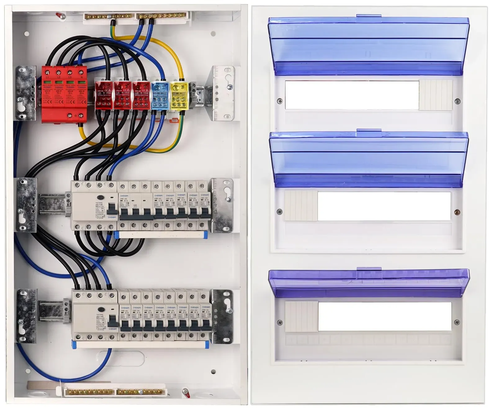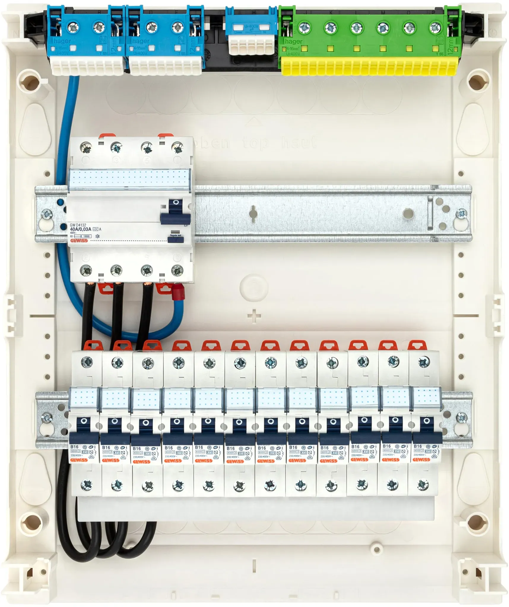 Kategorie: Sonstige Elektroinstallationsartikel - CusoTec - GTIN:4260756620754 - Komplett vorverdrahtete Unterverteilung 2 Reihig Aufputz. ANSCHLUSSFERTIG Zum Produkt: Sicherungsverteiler (Hager) inkl. weißer Tür. Bestückung: 1 x 40A FI RCD Schalter 30mA (Gewiss) 12 x B16 Sicherungsautomat (Gewiss) 3pol. Phasenschiene. Vorverdrahtung mit 10mm2 Aderleitung flexibel Abmessungen: Verteilerkasten (H x B x T) = 370 x 305 x 96,5mm, Farbe: Weiß Sie müssen nur noch Ihre Hauptstromzuleitung und die Verbraucher anschließen bzw. von einer Elektrofachkraft anschließen lassen. Die Verteiler werden bei uns sorgfältig vorverdrahtet und regelmäßigen Qualitätskontrollen unterzogen - 179,95 Euro bei Amazon Marketplace Automotive - gefunden von billiger.de Ein umfassender Verteilerkasten mit FI-Leistungsschalter Typ A und B16 Sicherungen, ideal für die Installation in größeren Anlagen. ![]() ![]() CHENGPI Verteilerkasten mit 4P FI Leistungsschalter Typ A 40A 30mA FI RCCB und B16 Sicherungen,Sicherungskasten mit 4P überspannungsschutz und Sammelschiene,Aufputz 3-Reihig Schaltschrank03