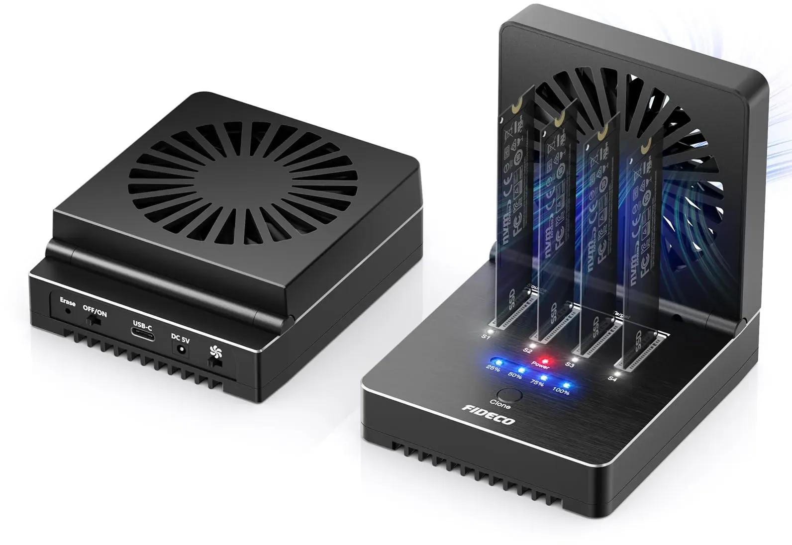 Auf Lager Versand durch AmazonFIDECO M.2 NVMe SATA SSD Cloner Dock, USB 3.2 Gen 2, 20 Gbit/s NVMe Cloner Duplikator mit faltbarem Kühlventilator, unterstützt Offline-Klone, UASP und TRIM, Aluminium-Design
